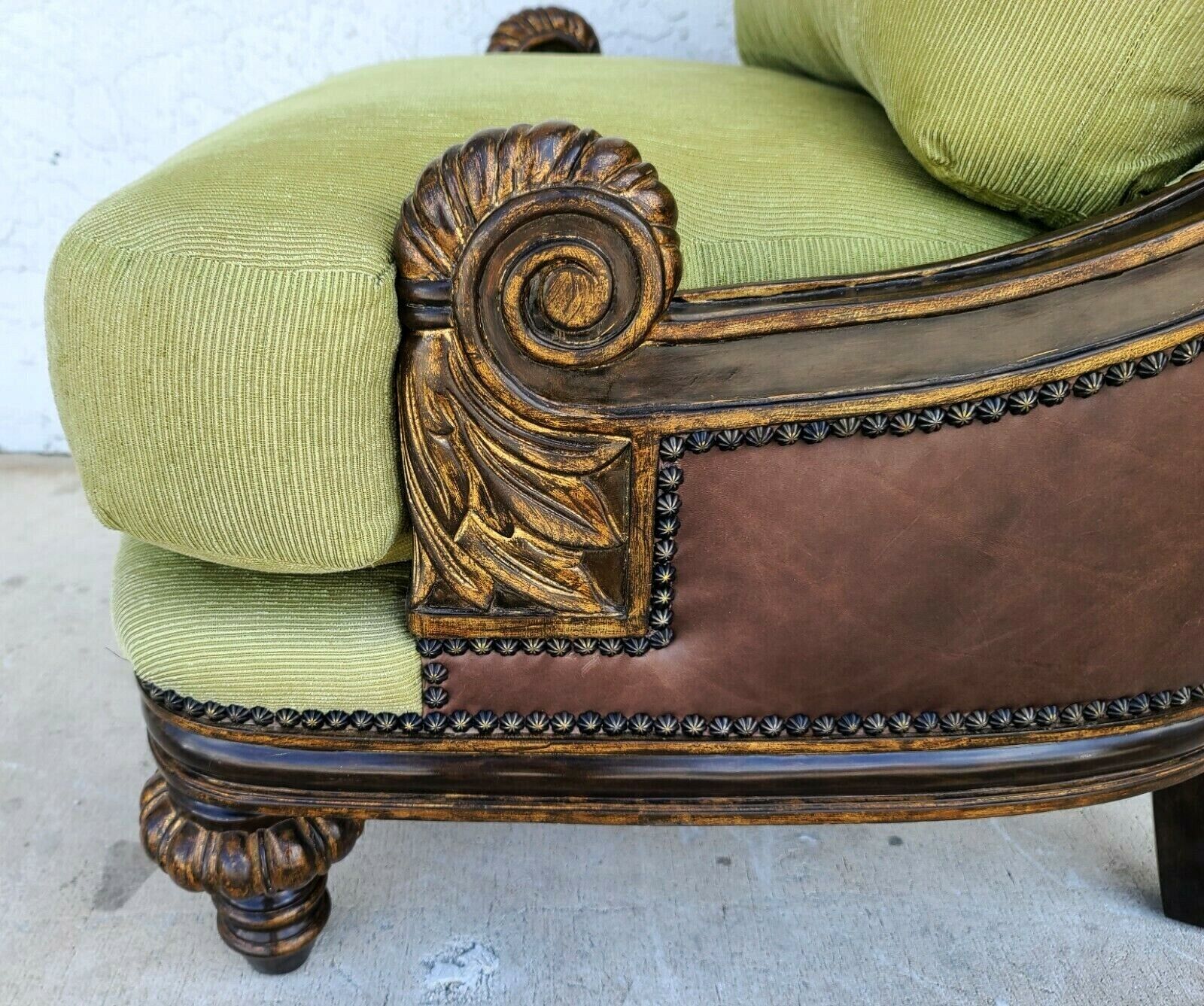 In good condition with no stains or other notable damage to fabric or wood. Leather has some minor imperfections.