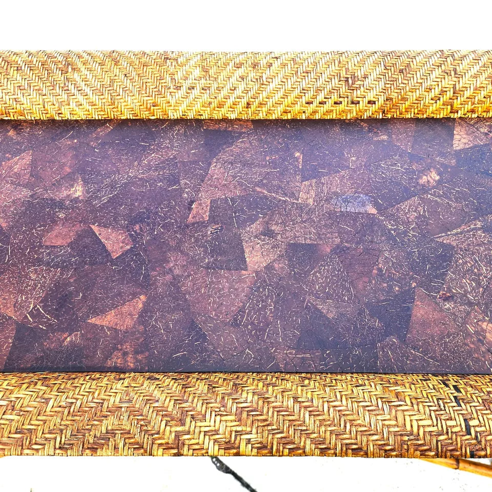 Featuring Leather Rattan strapping, and inlaid Coconut Shell top surrounded by a Wicker border.