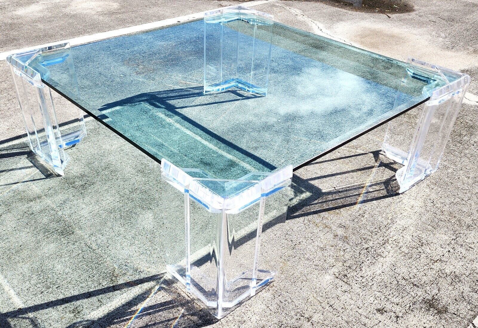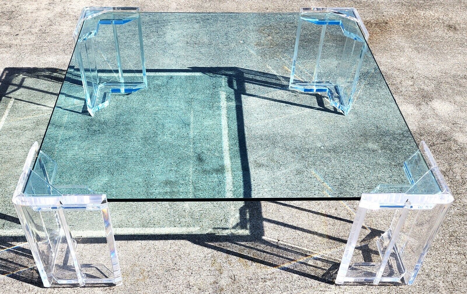 In good, structurally sound and sturdy condition with some small imperfections on the Lucite and light scratches possible on glass. Glass has a small chip/nick on the underside of 1 corner which is not visible when glass is inserted in leg slots. The photos are an important part of the item description and condition so please use the zoom feature to view them closely.