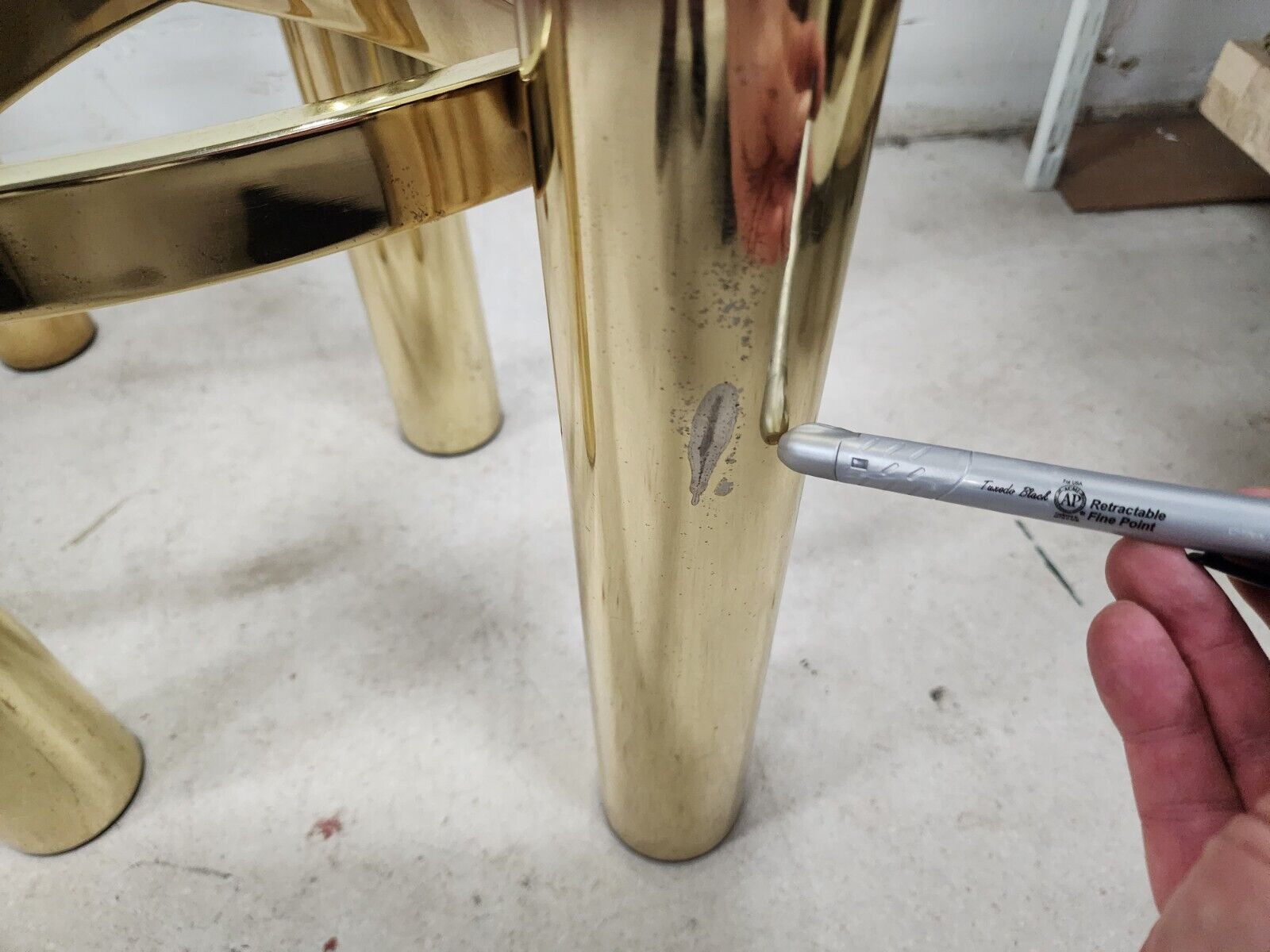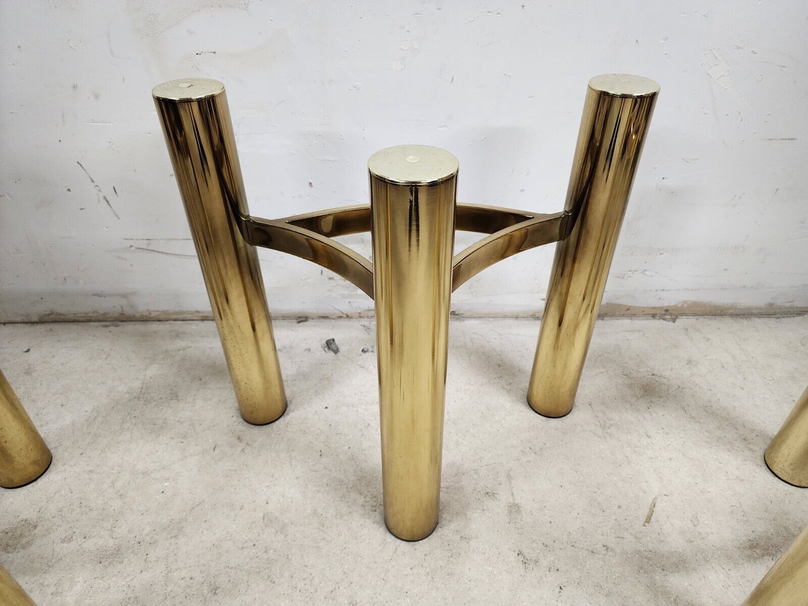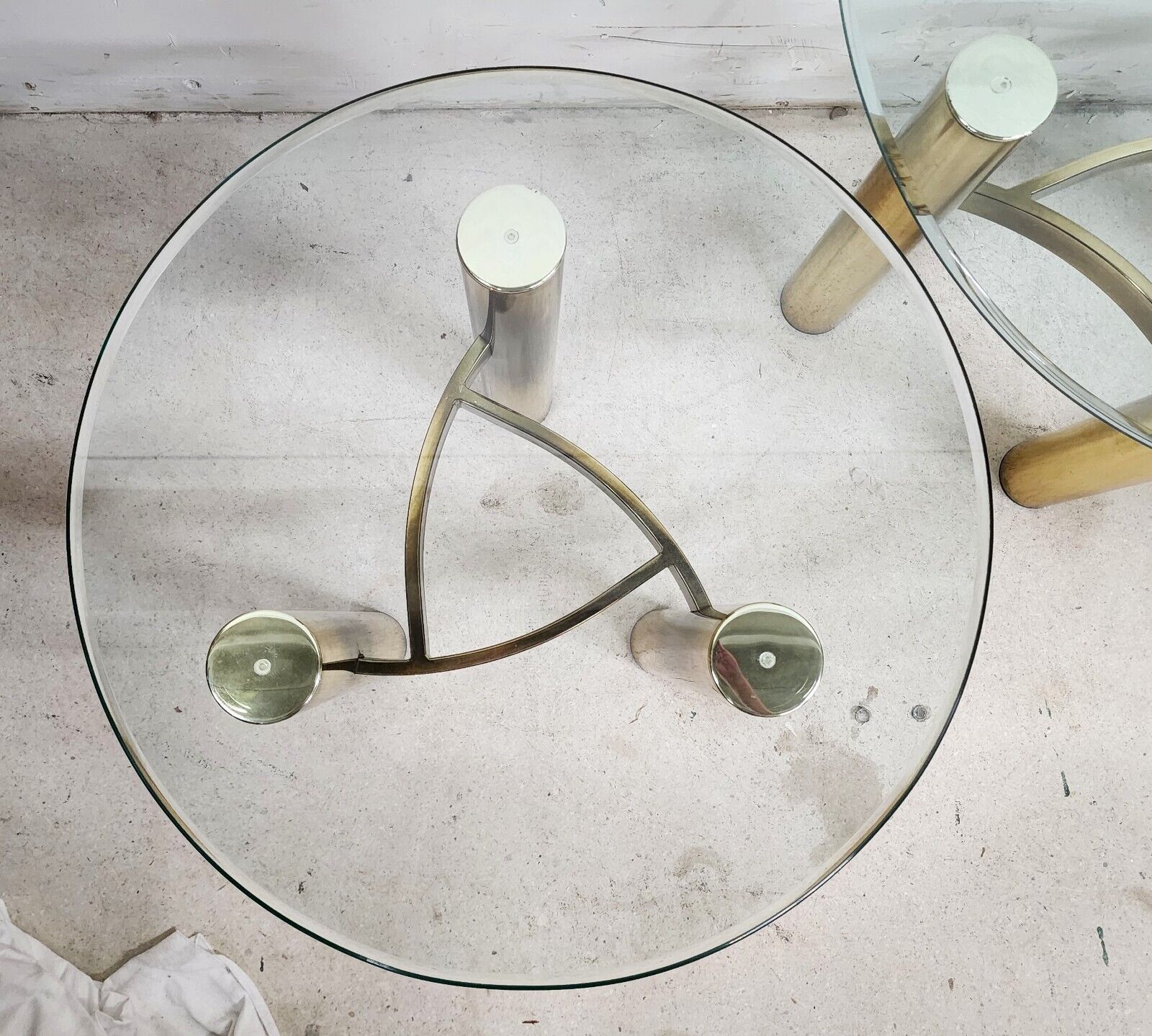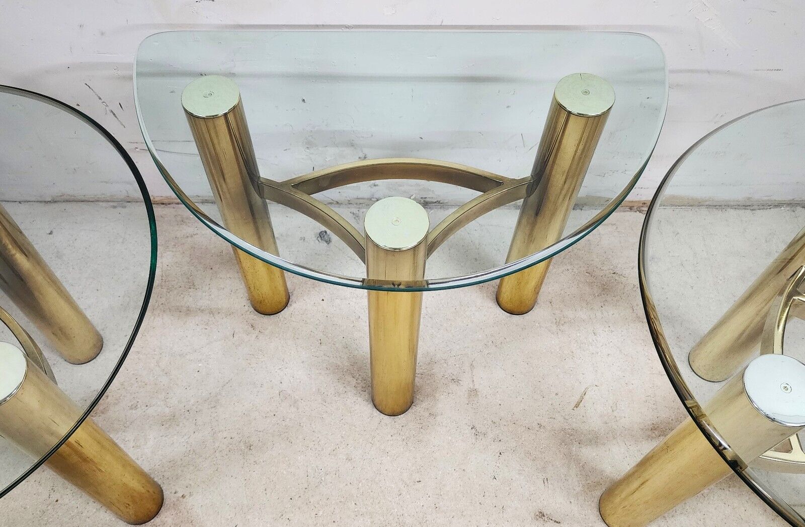In good, structurally sound and sturdy condition with no damage to original beveled Ogee edge glass tops but may have some light scratches. There are some spots of wear to the brass finish mostly near the bottoms of the legs. Most of the very dark areas in the photos are reflections. The photos and video are an important part of the item description and condition so please use the zoom feature to view them closely.