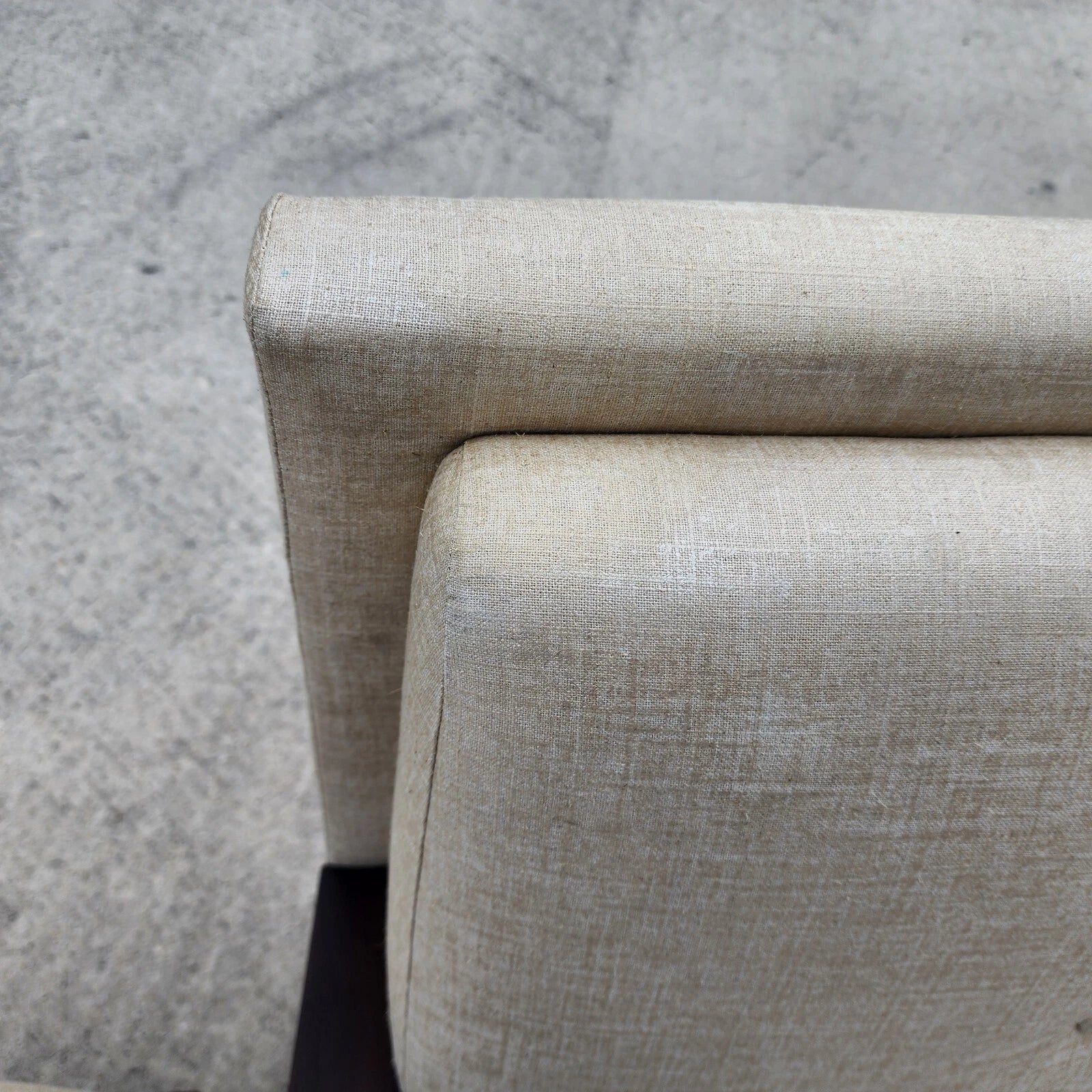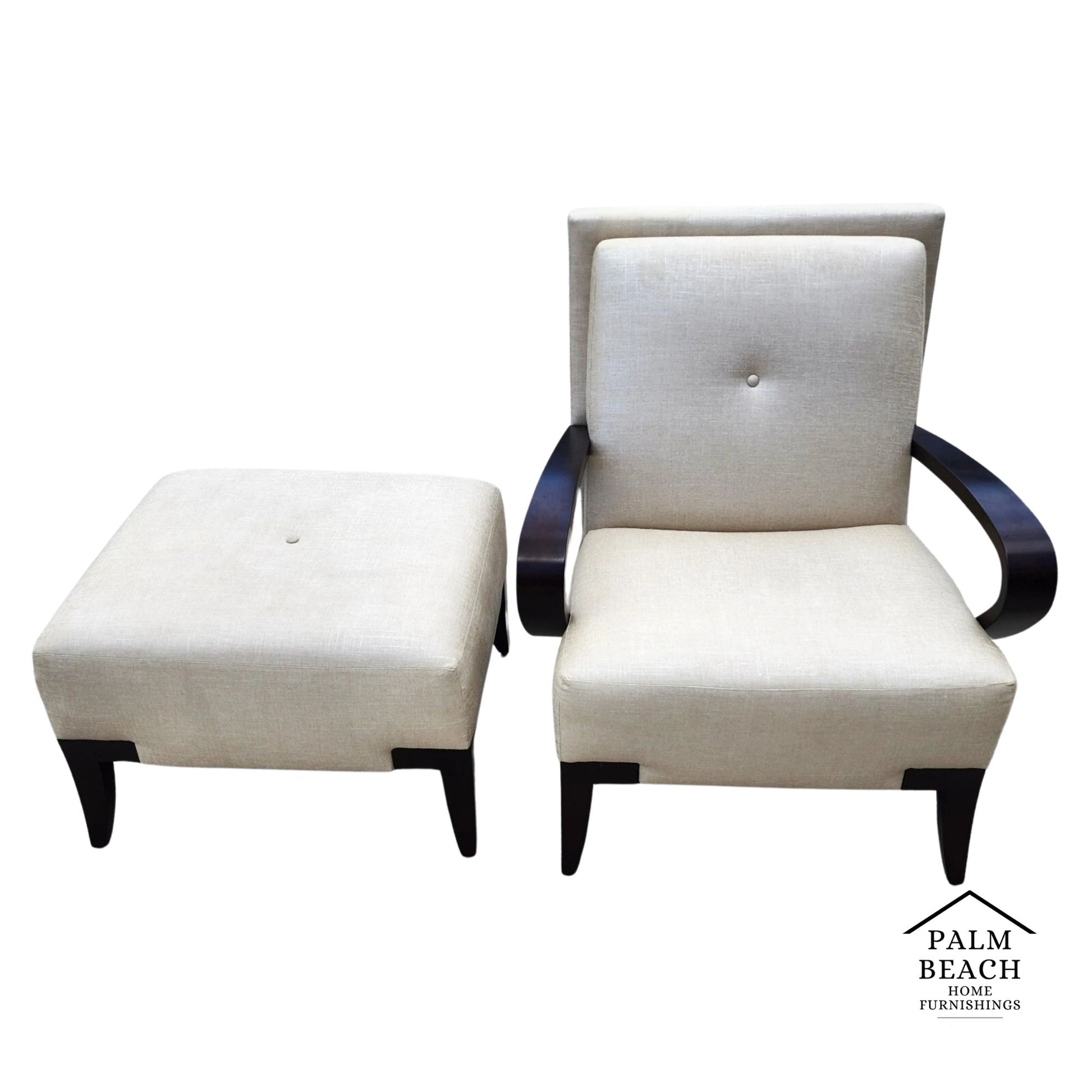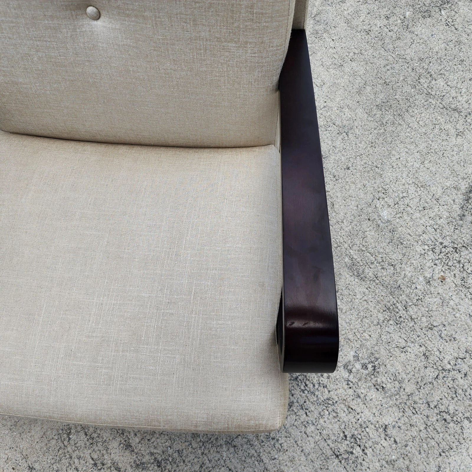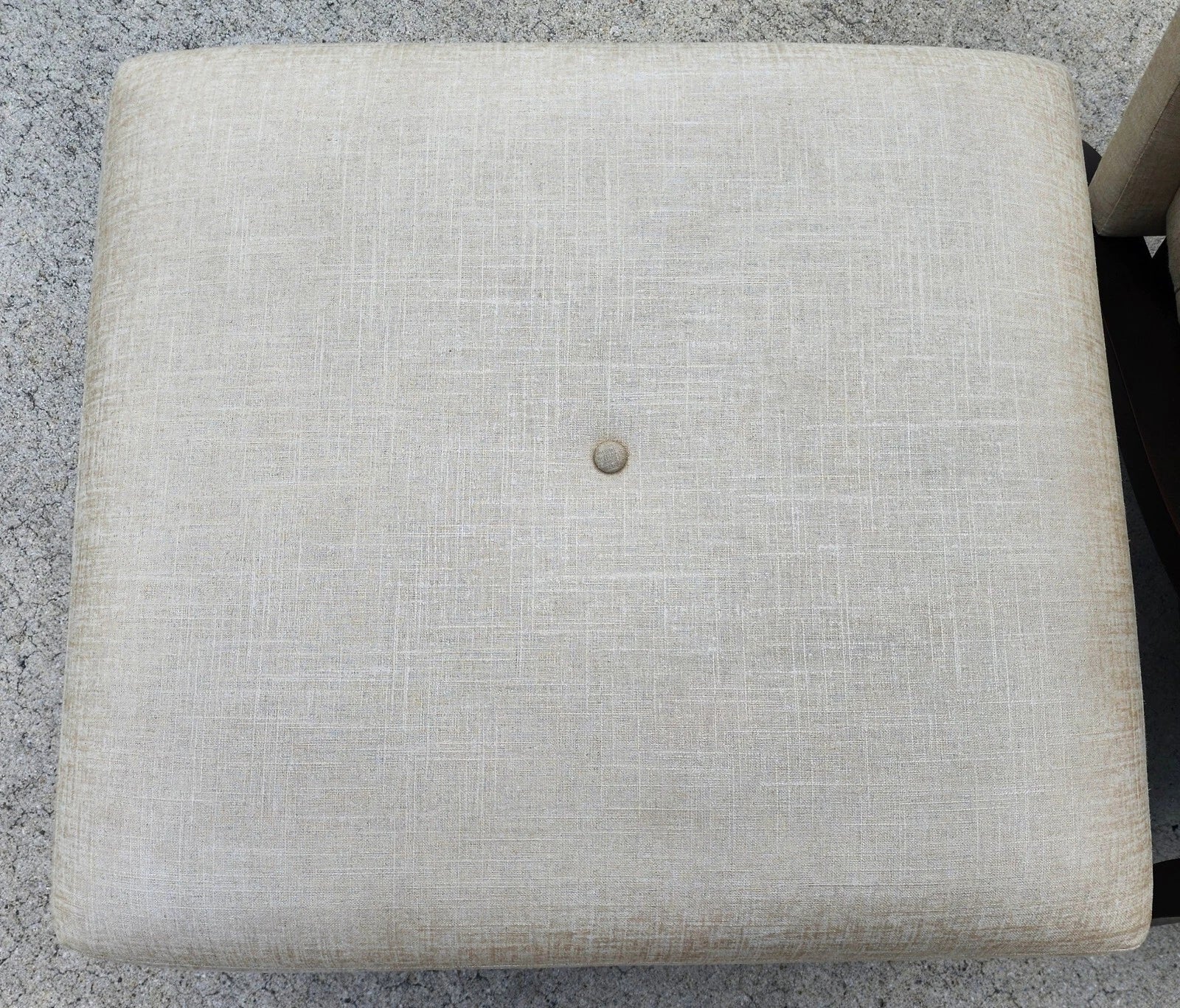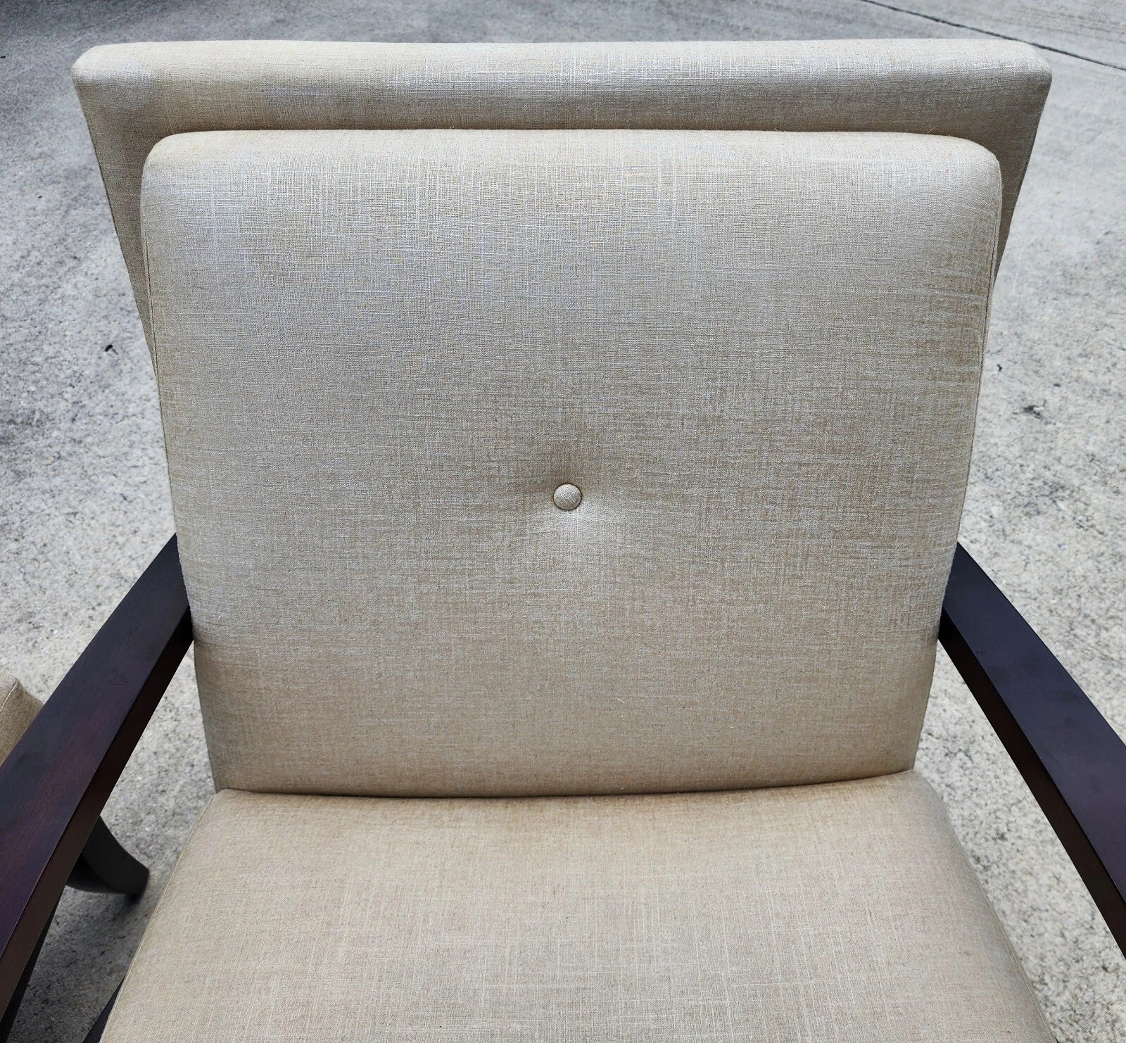 In good, structurally sound, and sturdy condition with no notable damage to frame. The chair has a very faint stain on the upper left hand corner and a few other ones on the upper right hand back side (last 2 photos). The ottoman has a very tiny faint spot on its top (3rd to last photo). These imperfections are very hard to see in normal room lighting. We photographed them in outdoor lighting. The photos and video are an important part of the item description and condition so please use the zoom feature to view them closely.