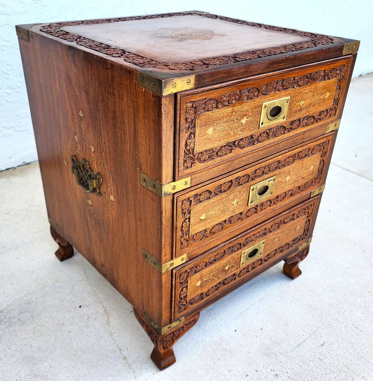 Mid-Century Campaign Style Anglo-Indian Carved Inlaid Brass Mounted Rosewood Chest Of Drawers