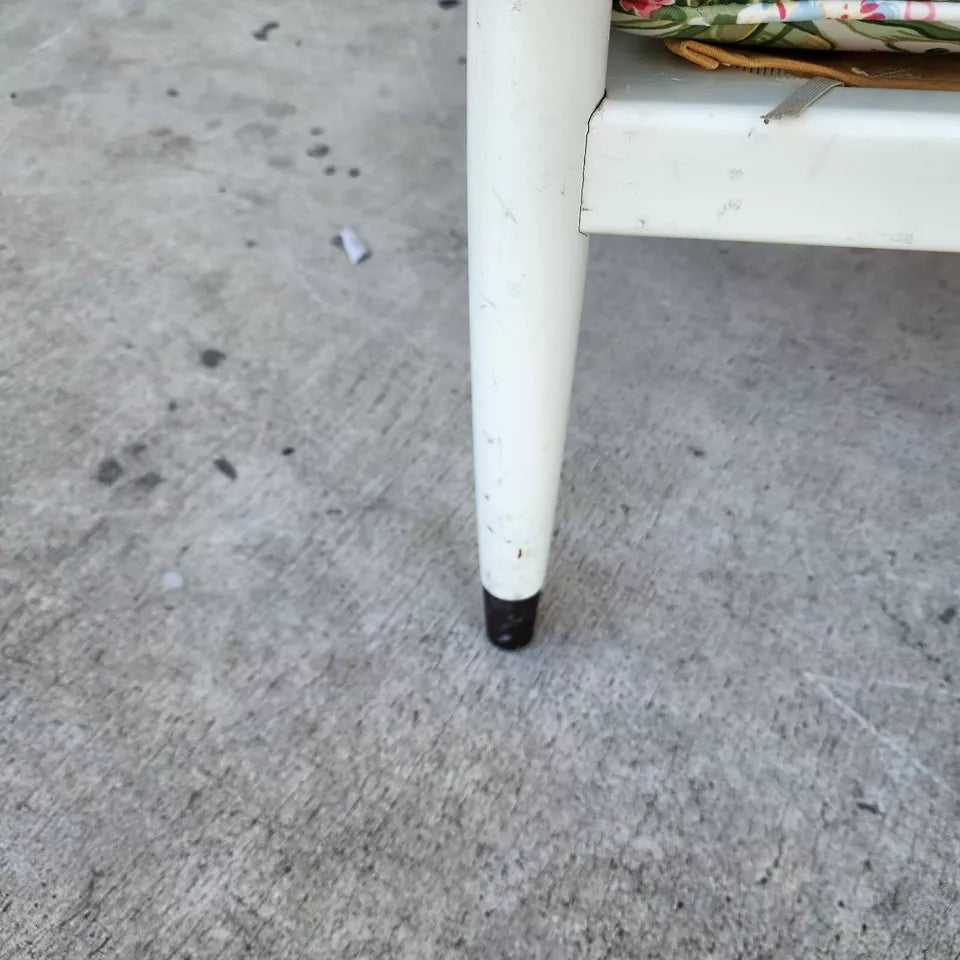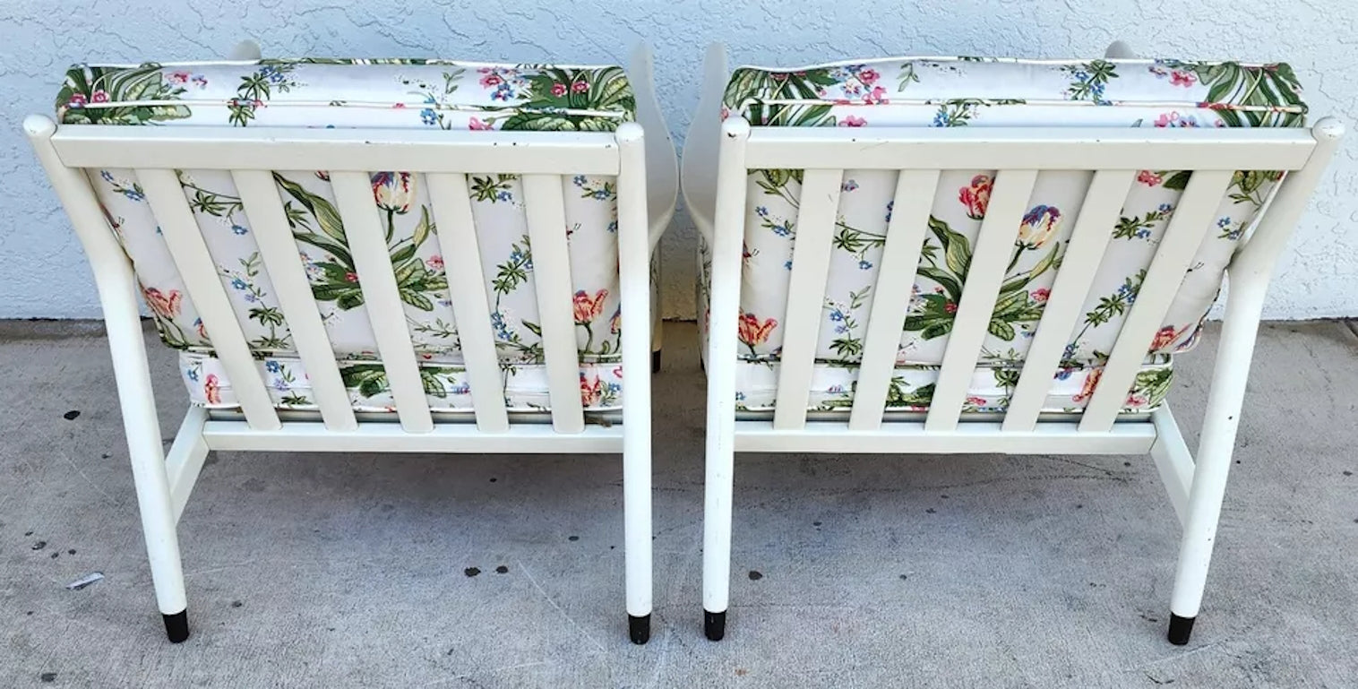 In good, structurally sound, and sturdy condition. Fabric is spotless. Wood frame has some imperfections to painted finish. 1 spring seat support is missing but it does not effect the way the cushion sits. The photos and video are an important part of the item description and condition so please use the zoom feature to view them closely.