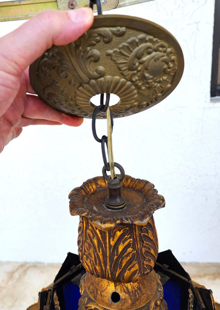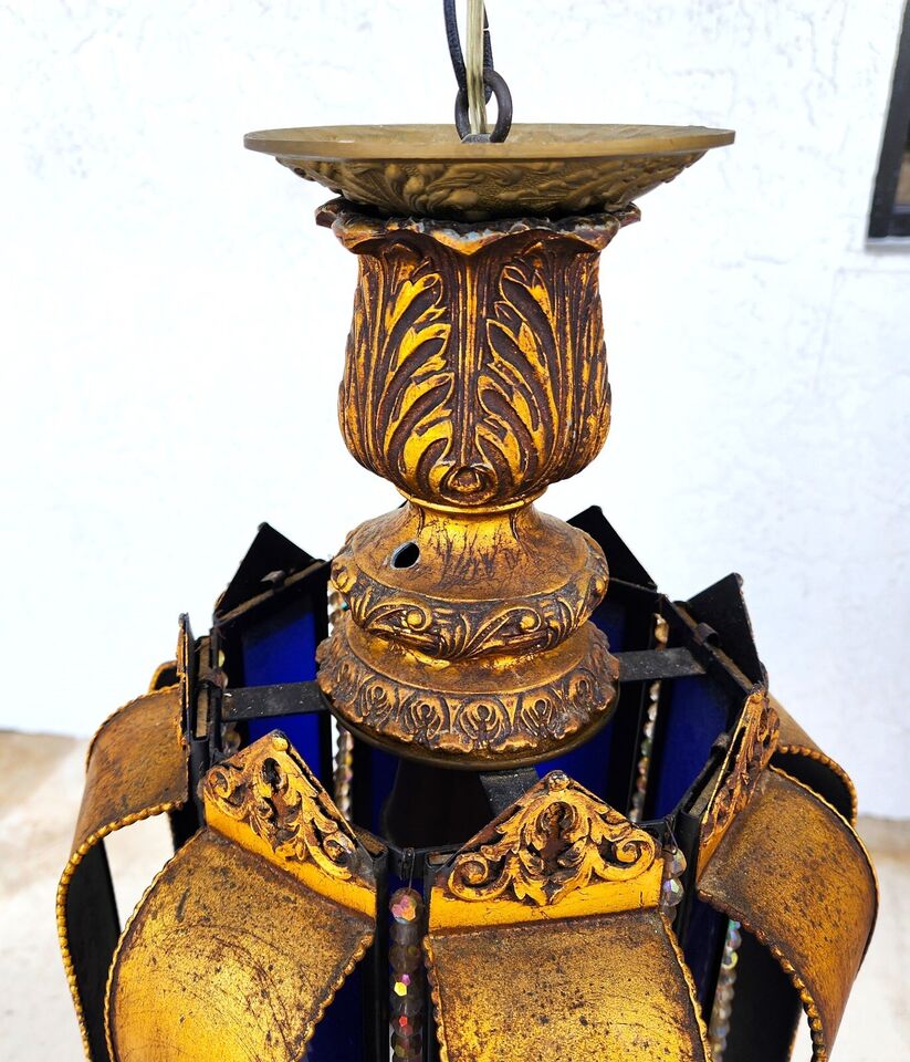 With Cobalt Blue and White Stained Glass, crystal beads and gold leaf finish.