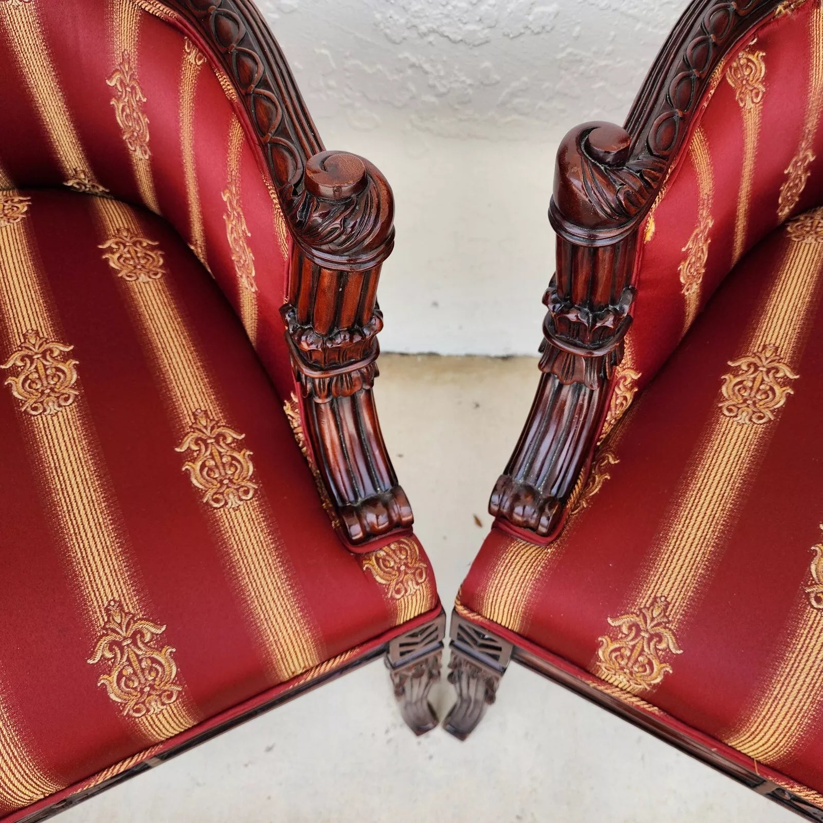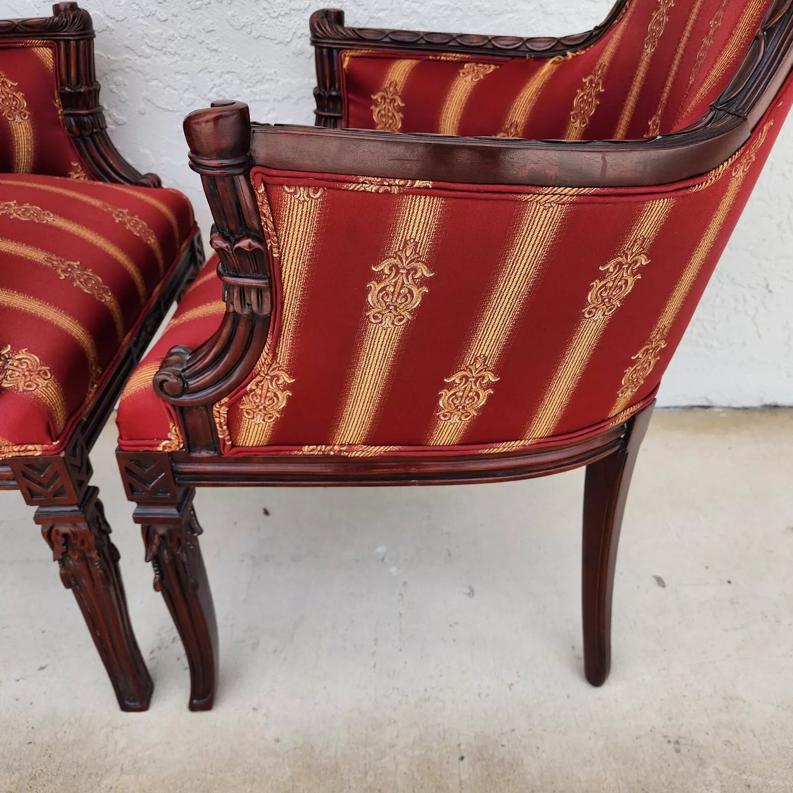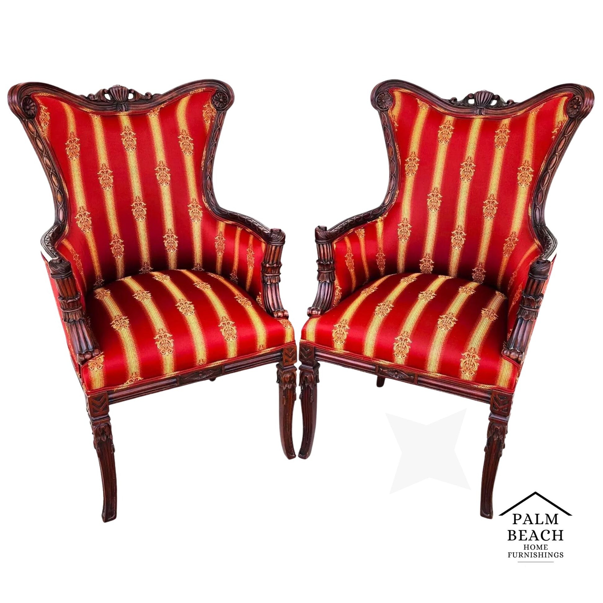 Embrace the allure of history with our pair of antique French Napoleon III style chairs, with fabric that tells a tale of timeless elegance. Their dark wood hand carved frames exude sophistication, adorned with exquisite carved detailing that speaks to the craftsmanship of a bygone era. These chairs are not just seats, but cherished relics of opulent design, ready to infuse any space with Old World charm and refinement.