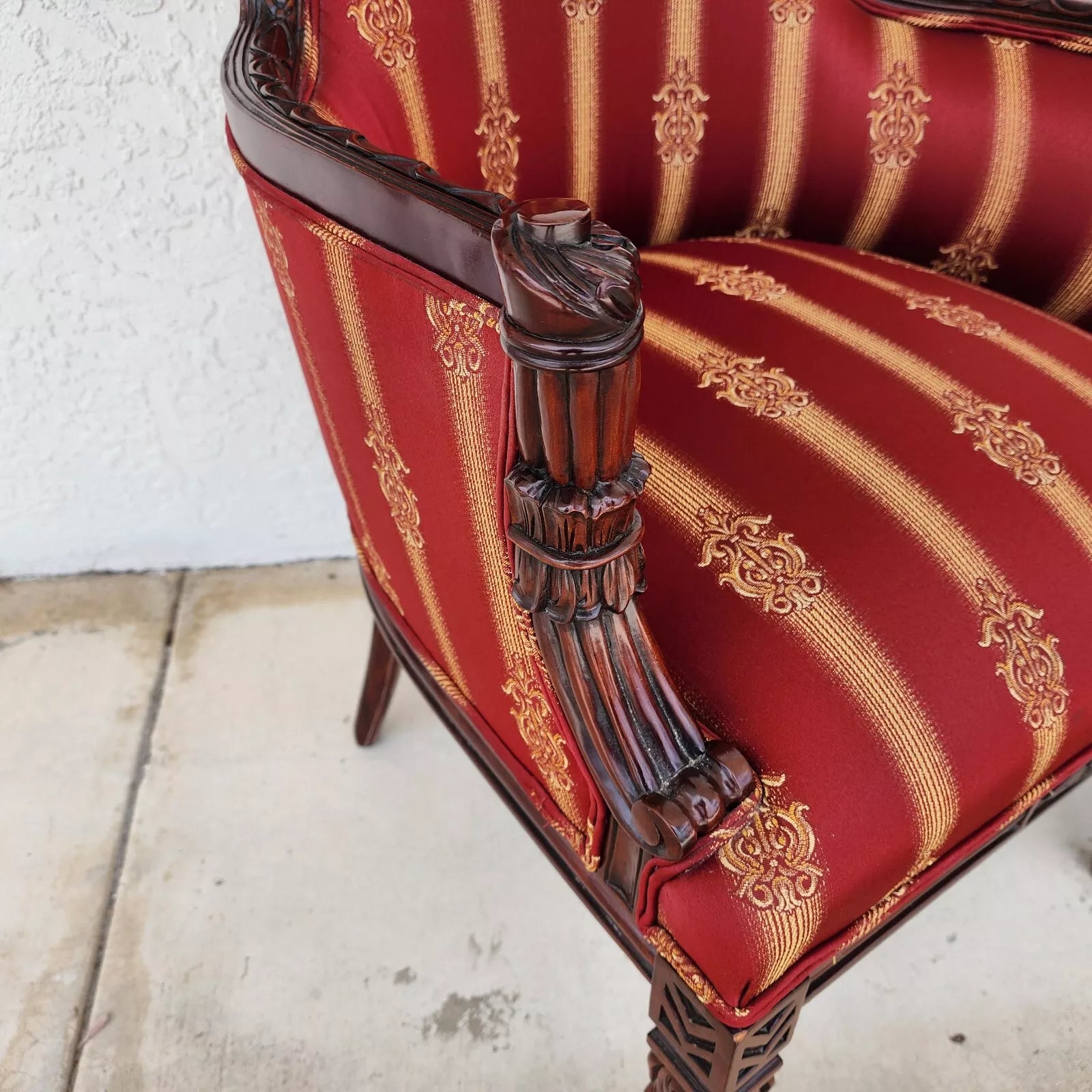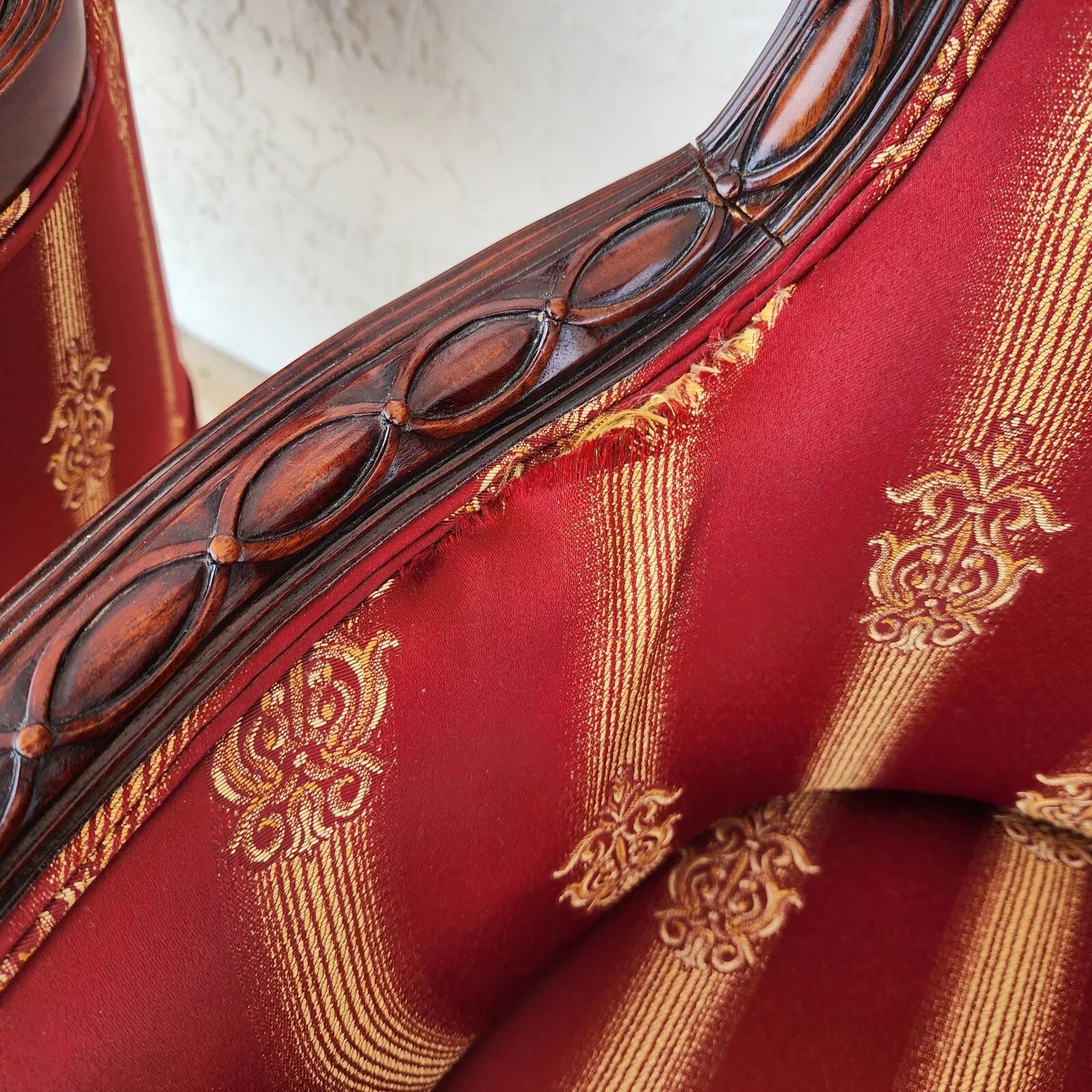 In good, structurally sound, and sturdy condition with no notable damage to wood frames. The fabric is spotless but there is a tear at the inside seam just below the arm on 1 chair as shown in the last photo. The photos and video are an important part of the item description and condition so please use the zoom feature to view them closely.