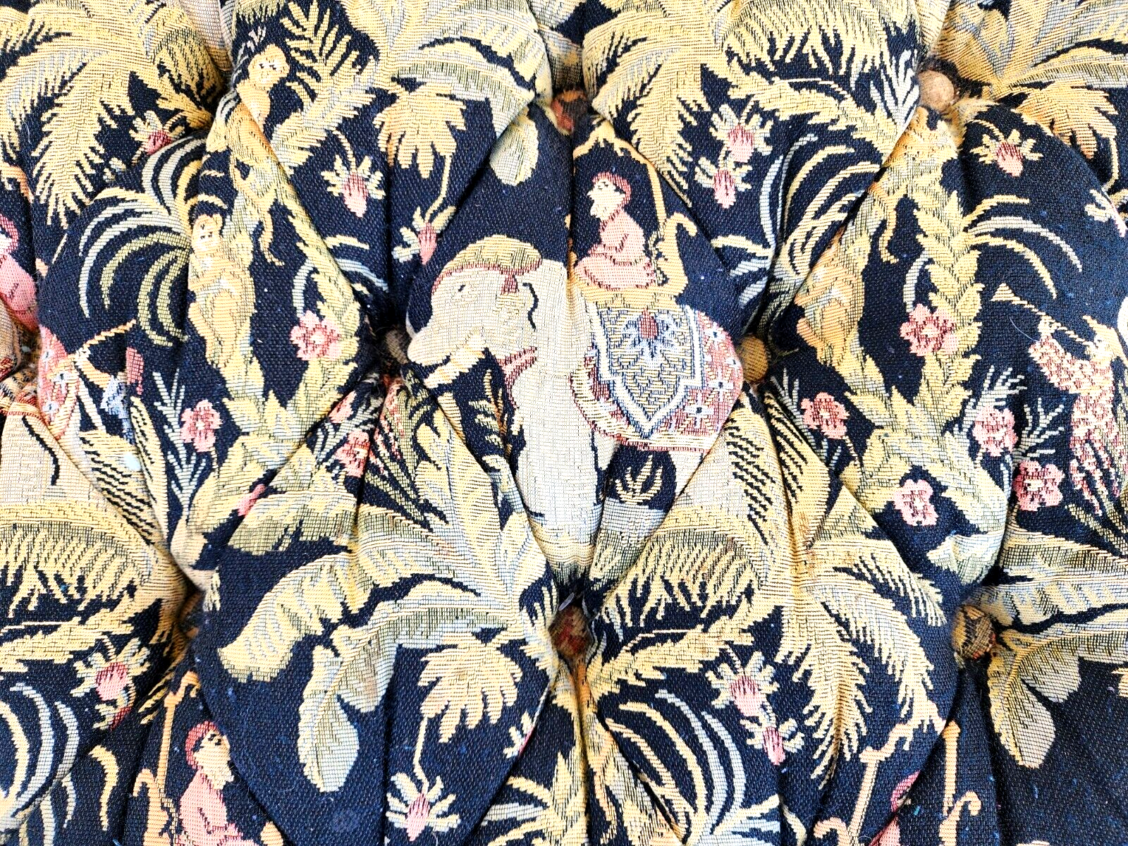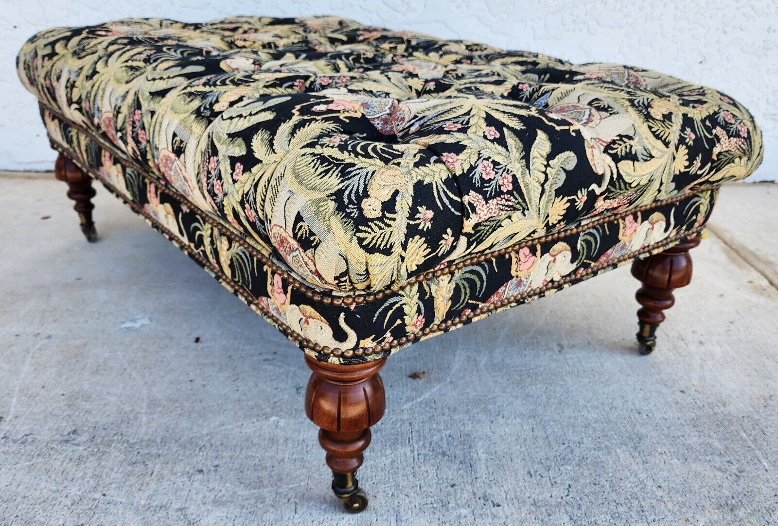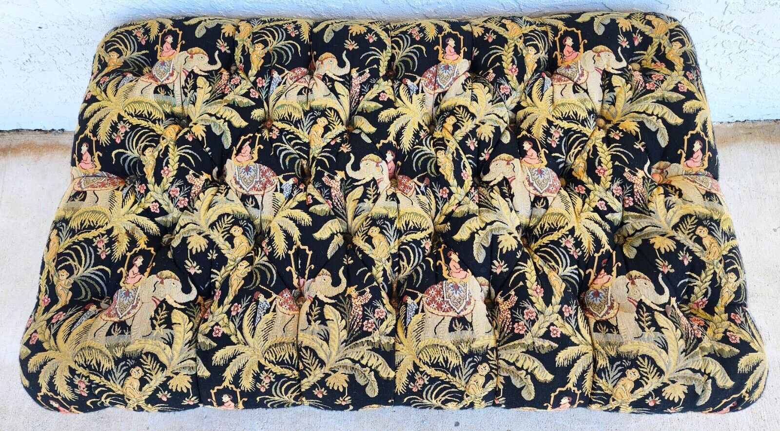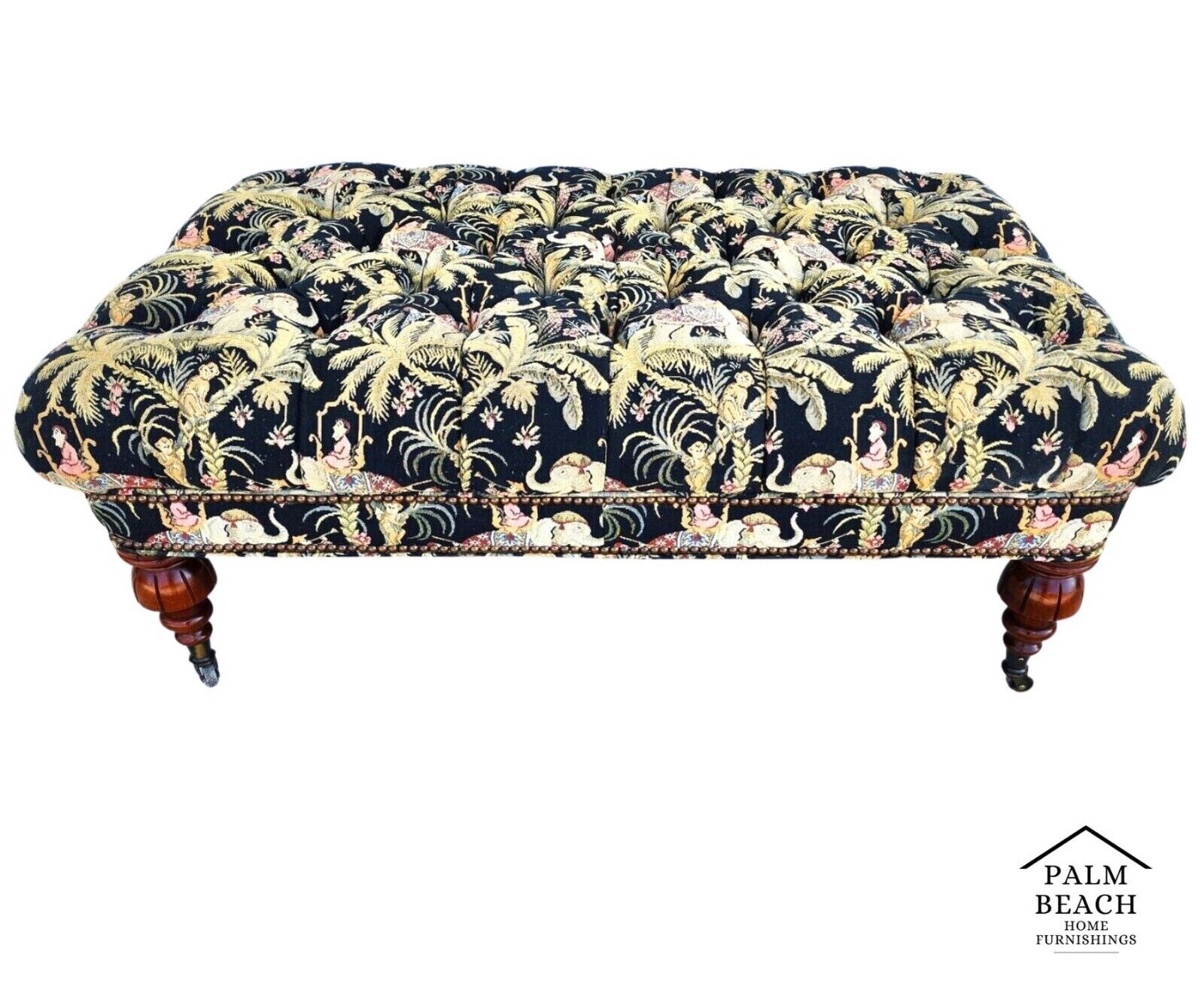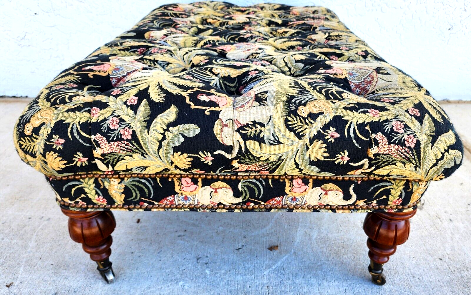 Oversized Ottoman Table Tufted Rolling on Brass Casters with Elephants, Monkeys, Jungle...