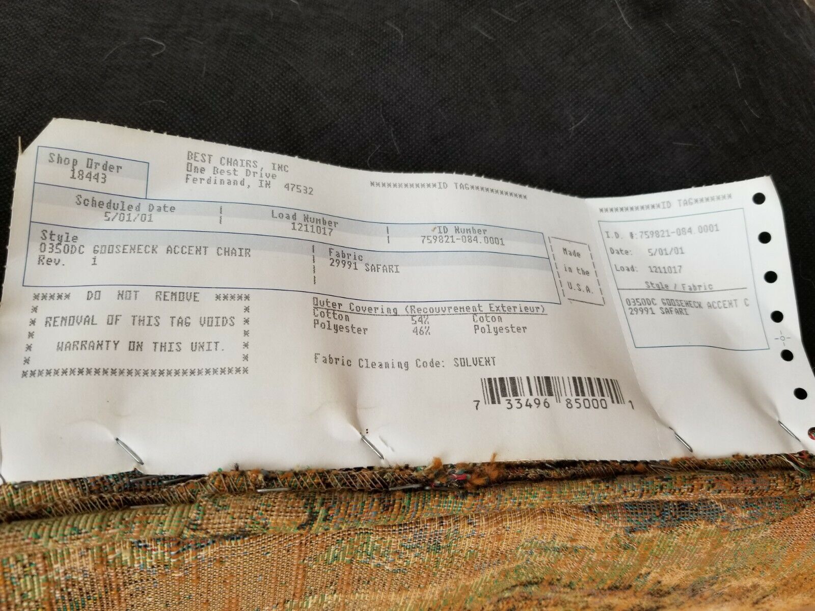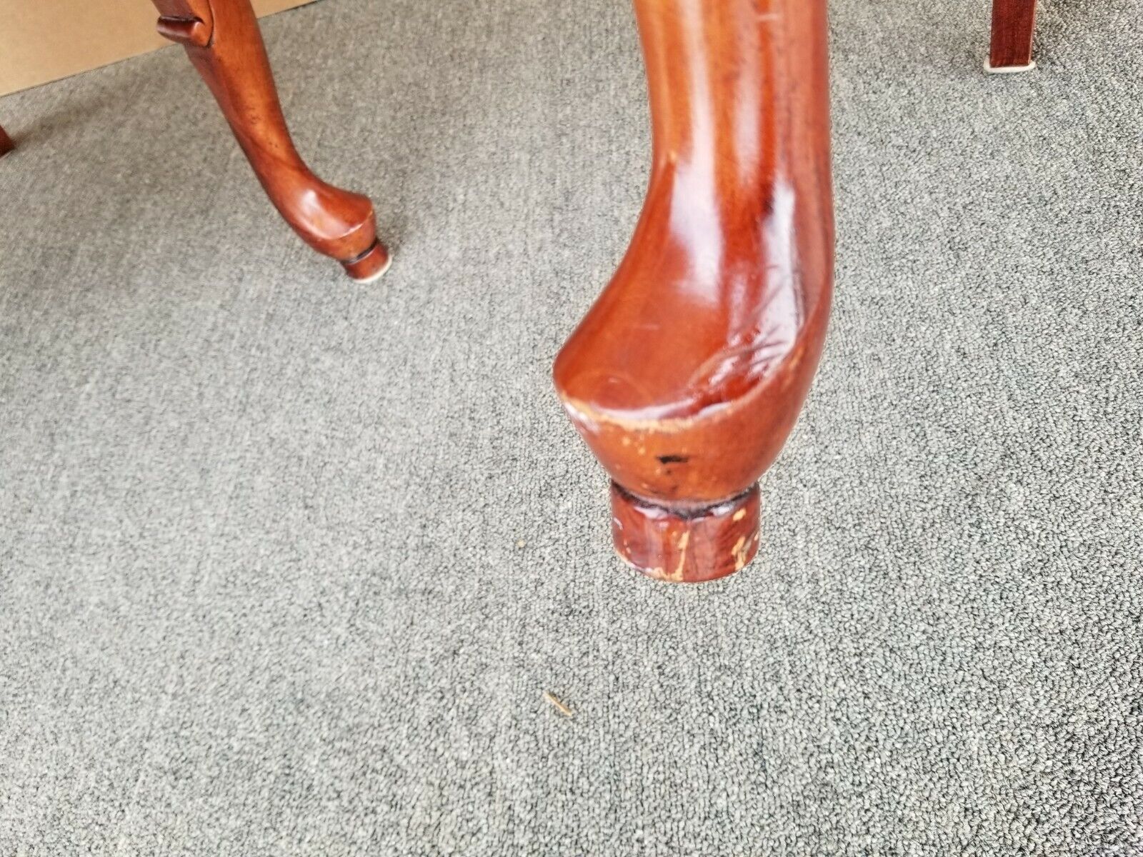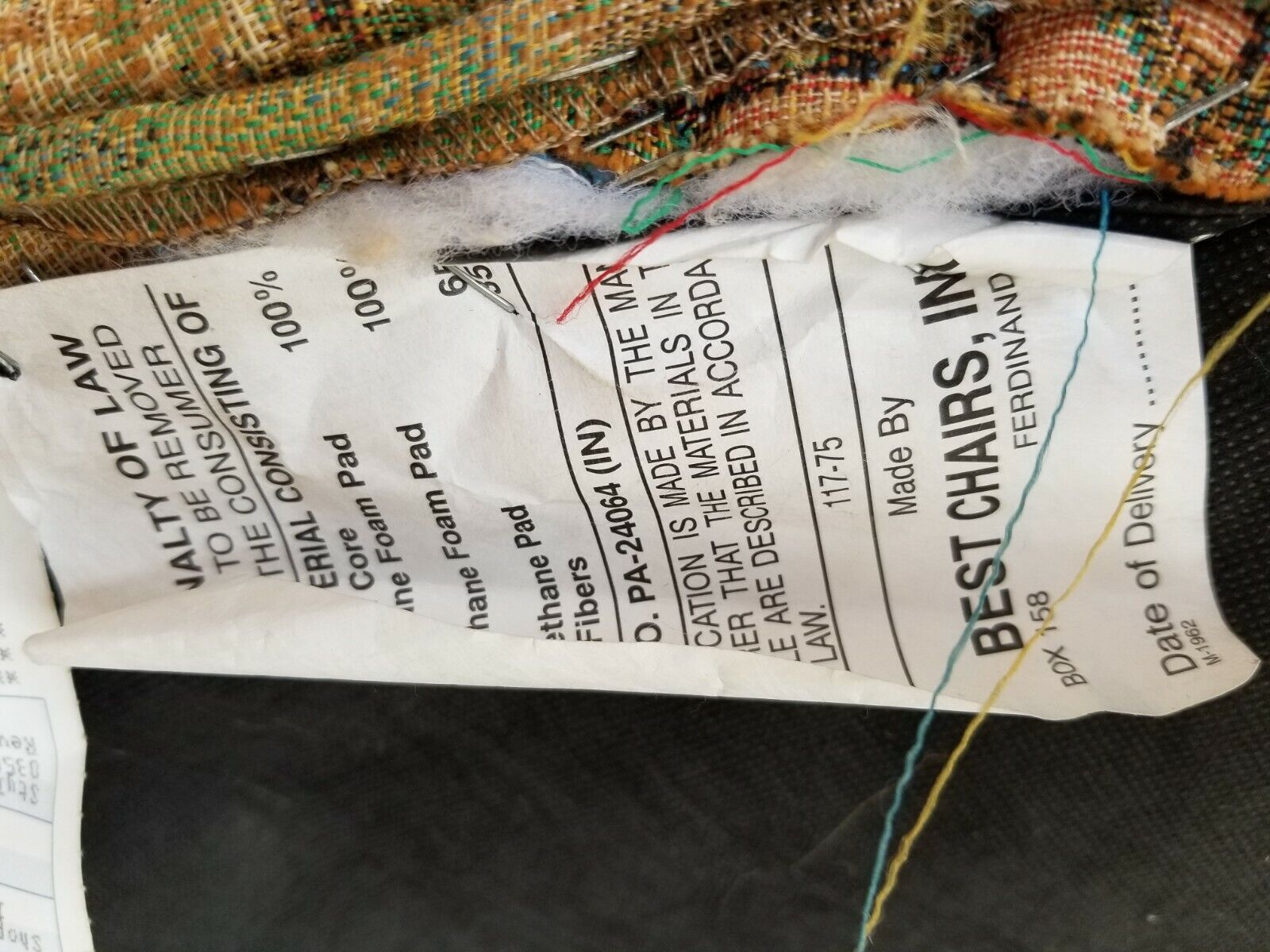 In good structurally sound condition with no stains or other damage to fabric. There are a couple of small scratches on the arms, and some dings and scratches to the wood mostly at the bottoms of the legs and the worst of these are shown in pic 8.