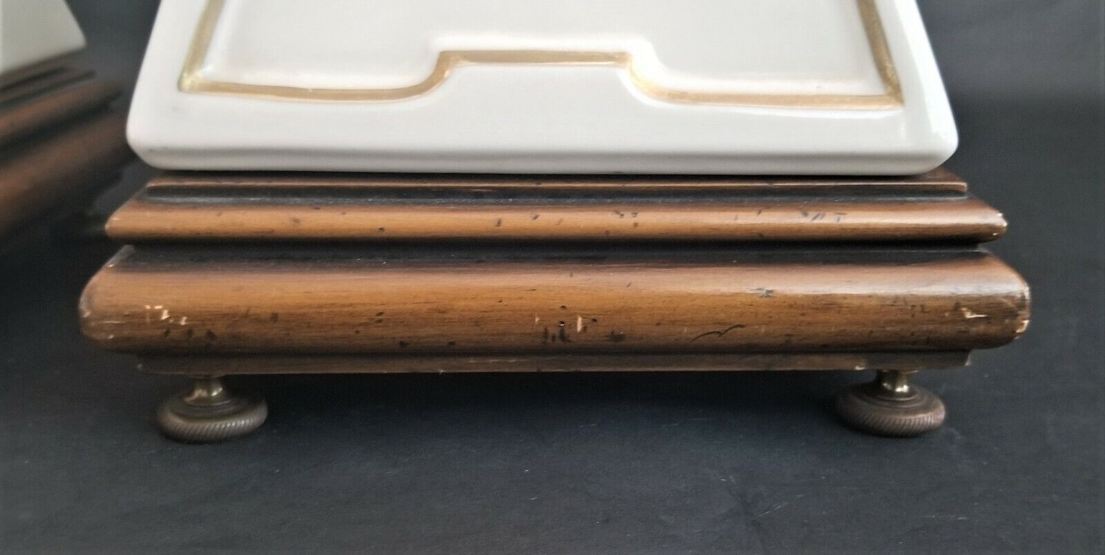 Pair of STIFFEL LENOX Obelisk Torchier Porcelain and Brass Table Lamps in Cream with Gold Accents, Wood Bases, and Brass Feet