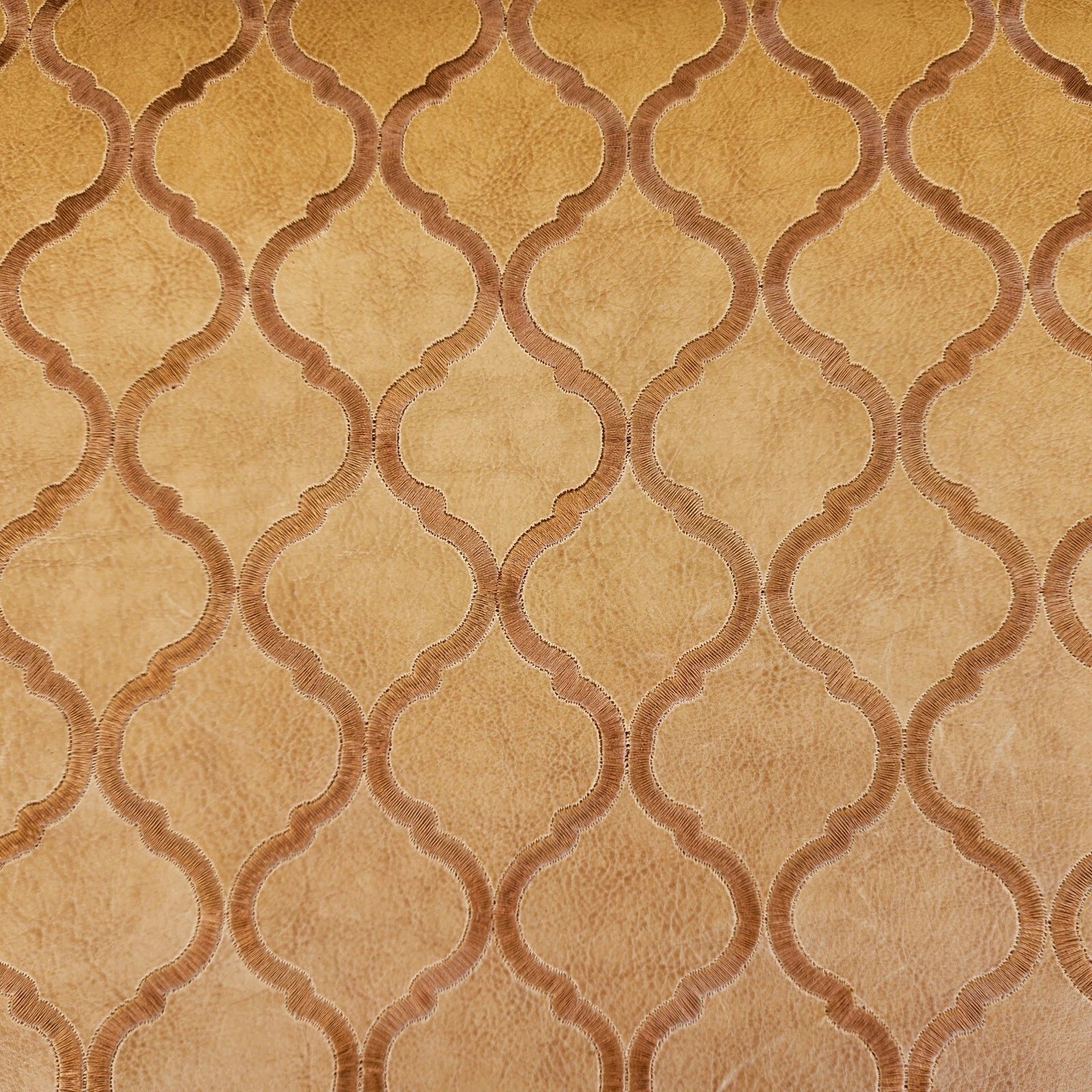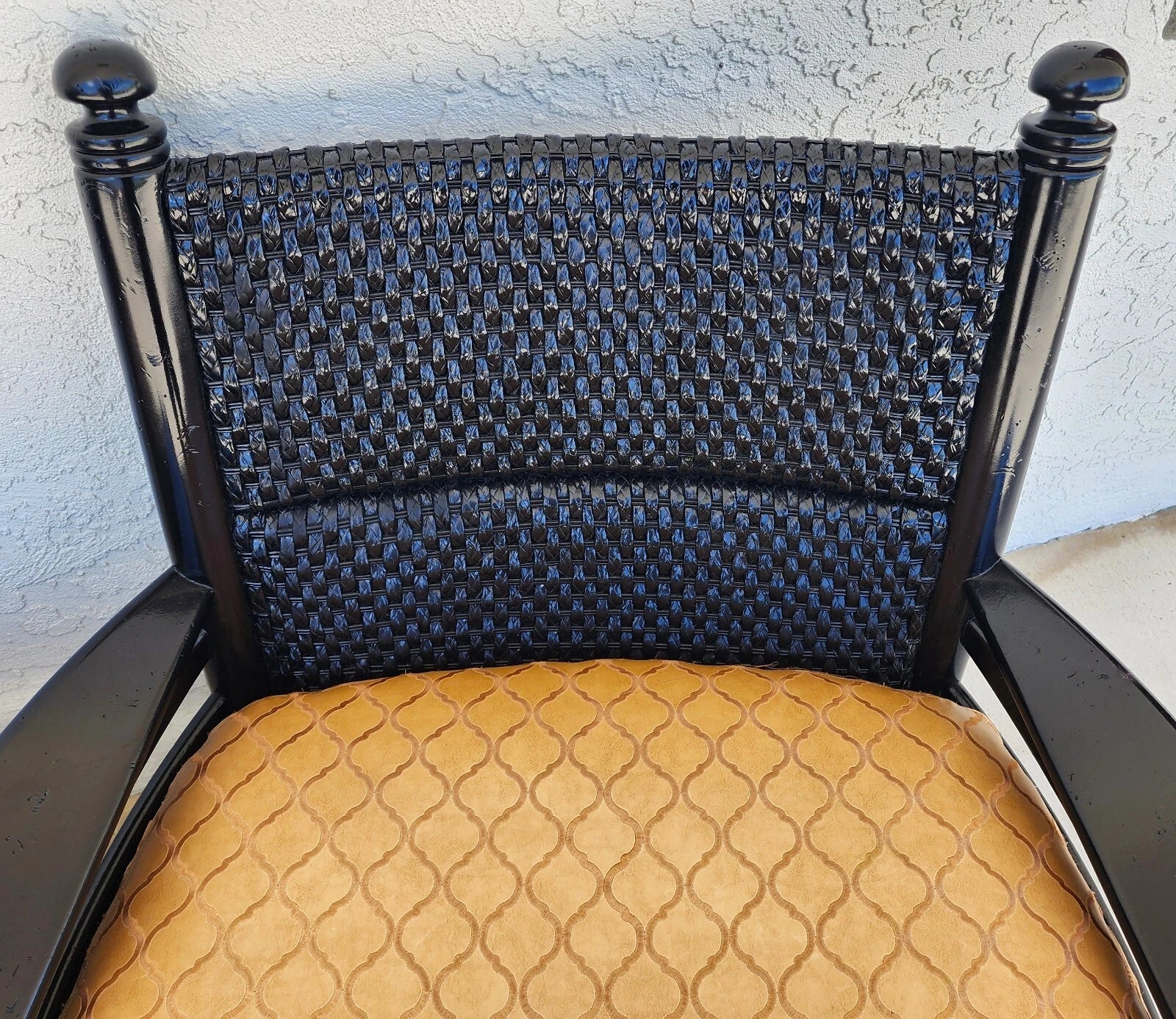 Upholstery is soft synthetic leather-like fabric with an embroidered pattern. They have been painted so the Seagrass and Rope are sealed making them useable indoors or on an outside covered porch.
