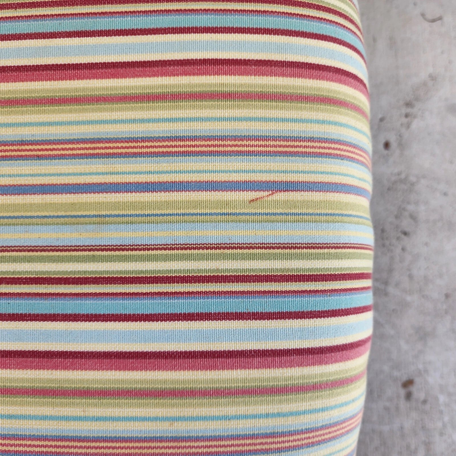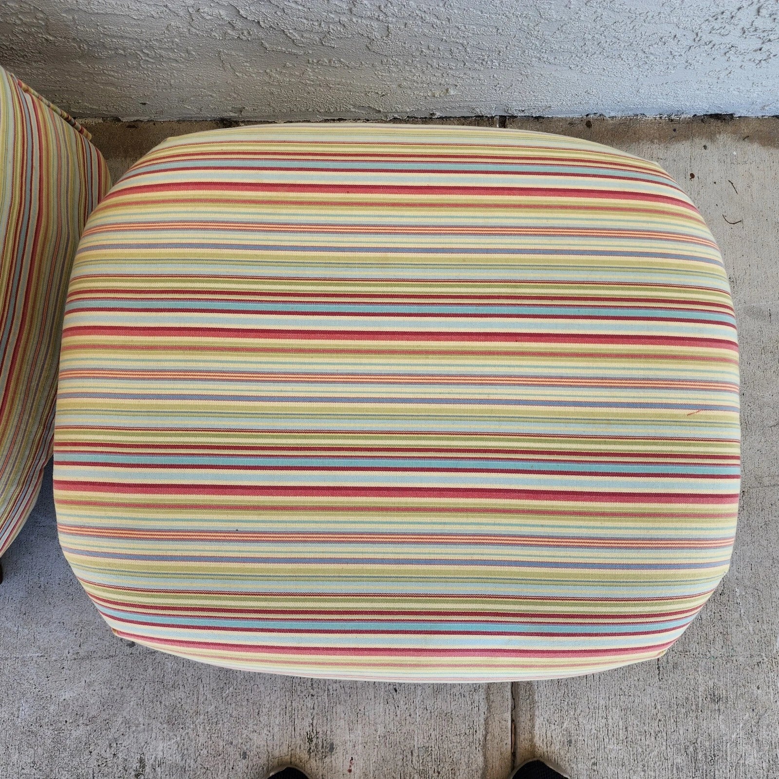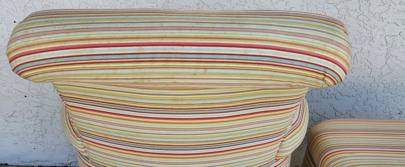 In structurally sound, and sturdy condition. The fabric has no soiling or smells but there is foxing (spotting) on the upper back and 1 side of the chair, and a few more on the sides of the ottoman as shown in photos and video. The photos and video are an important part of the item description and condition so please use the zoom feature to view them closely.