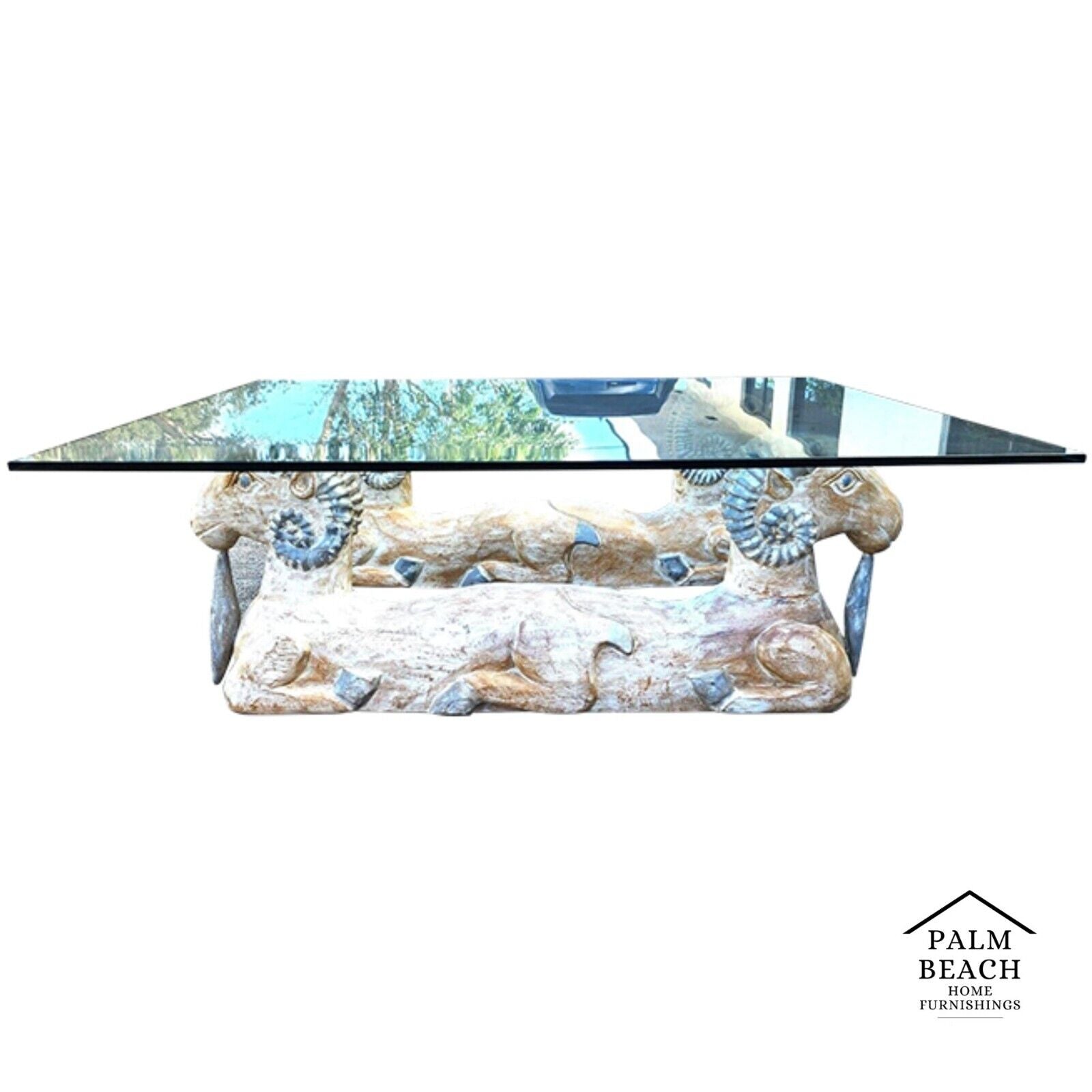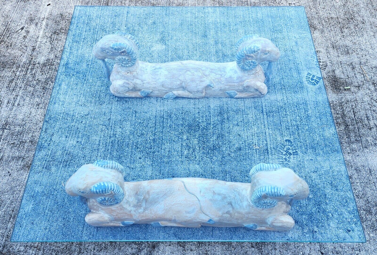 In good, structurally sound and sturdy condition with no notable damage to carved Rams. Glass is tempered and has no nicks or chips but may have some light scratches. The photos are an important part of the item description and condition so please use the zoom feature to view them closely.