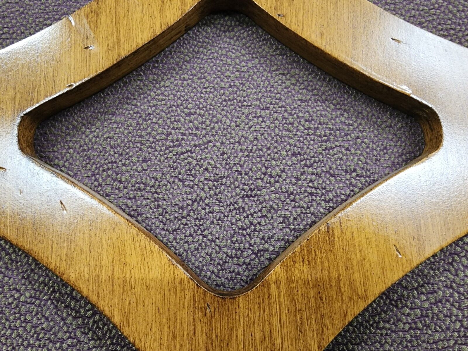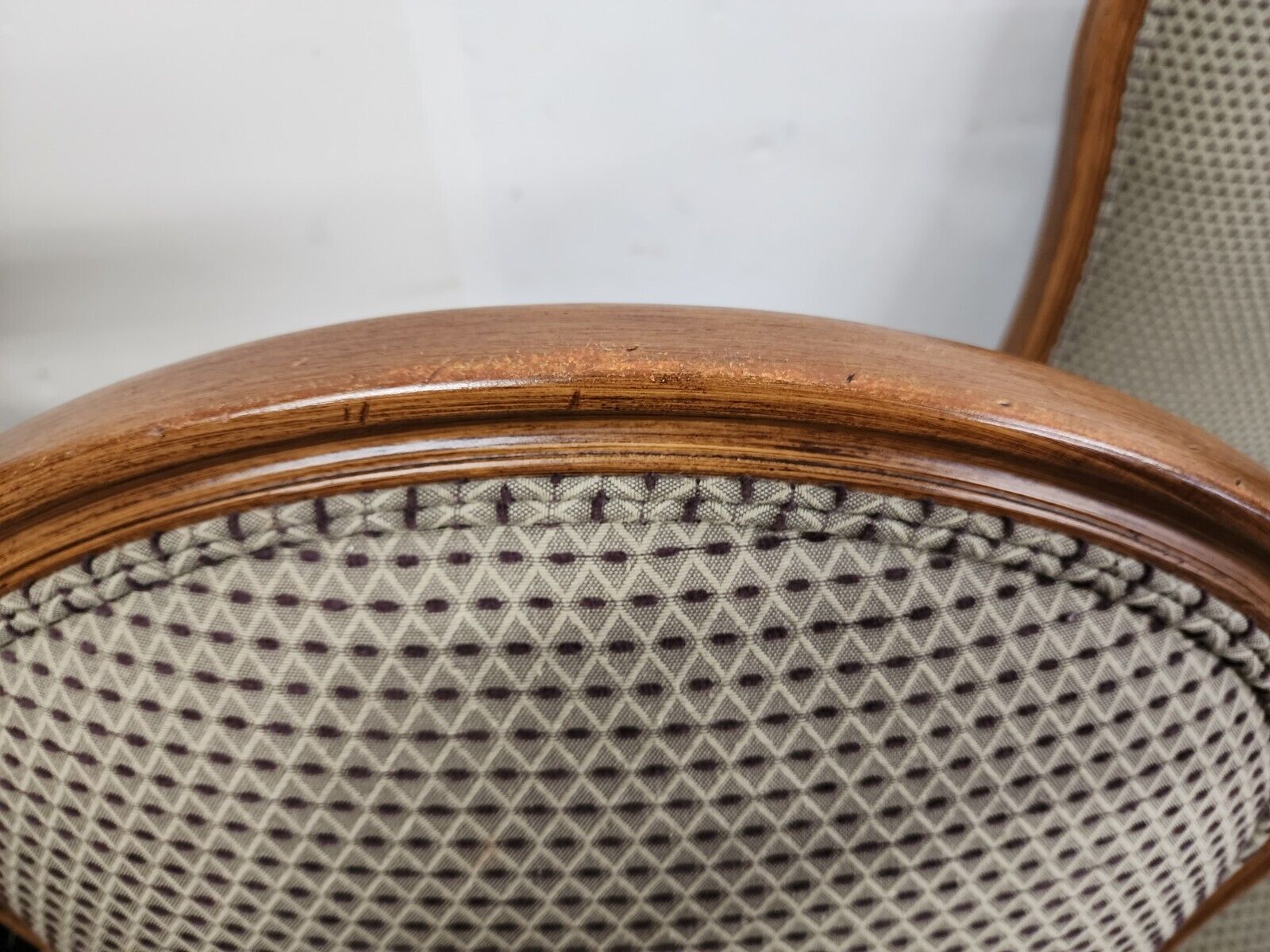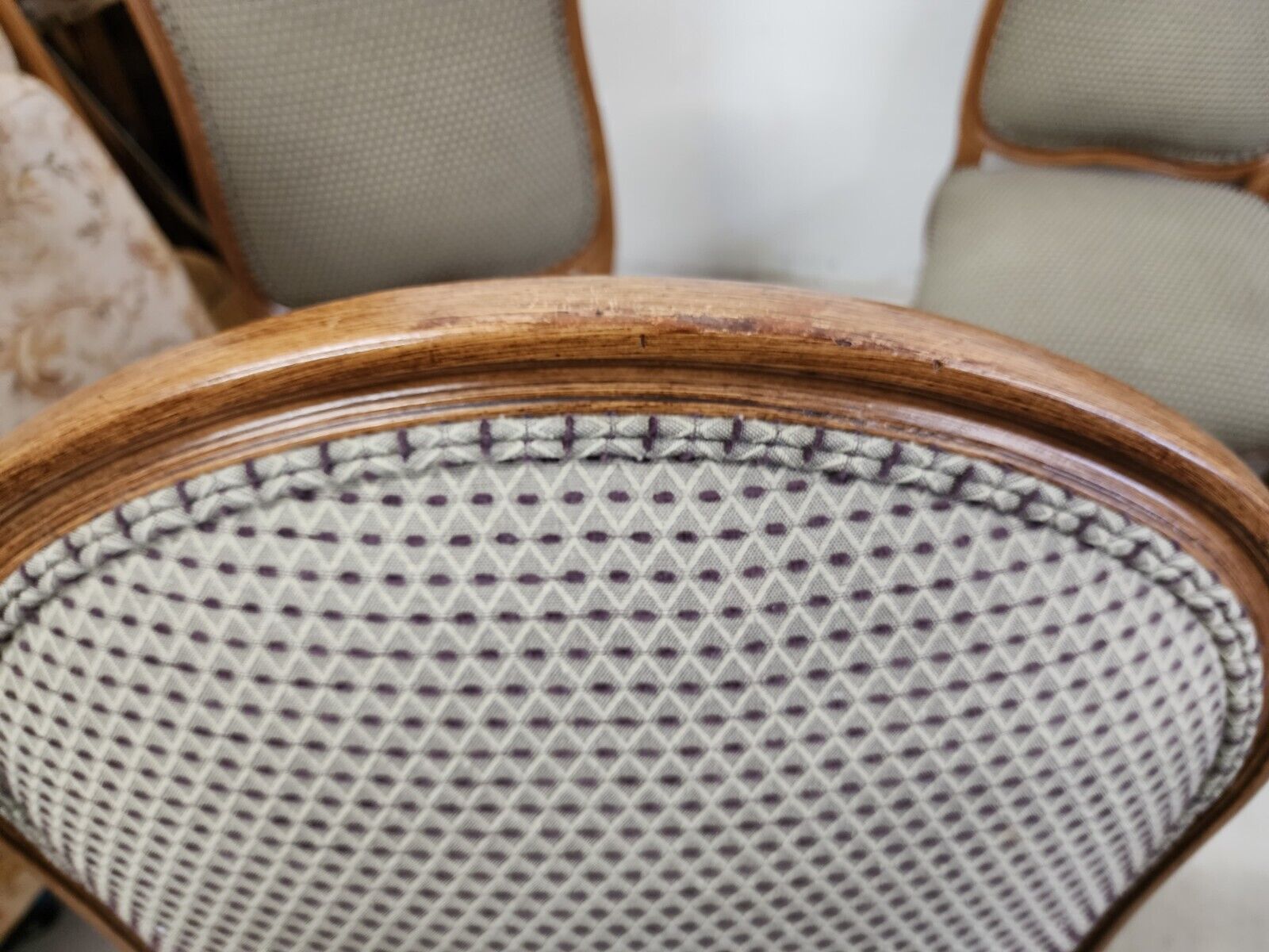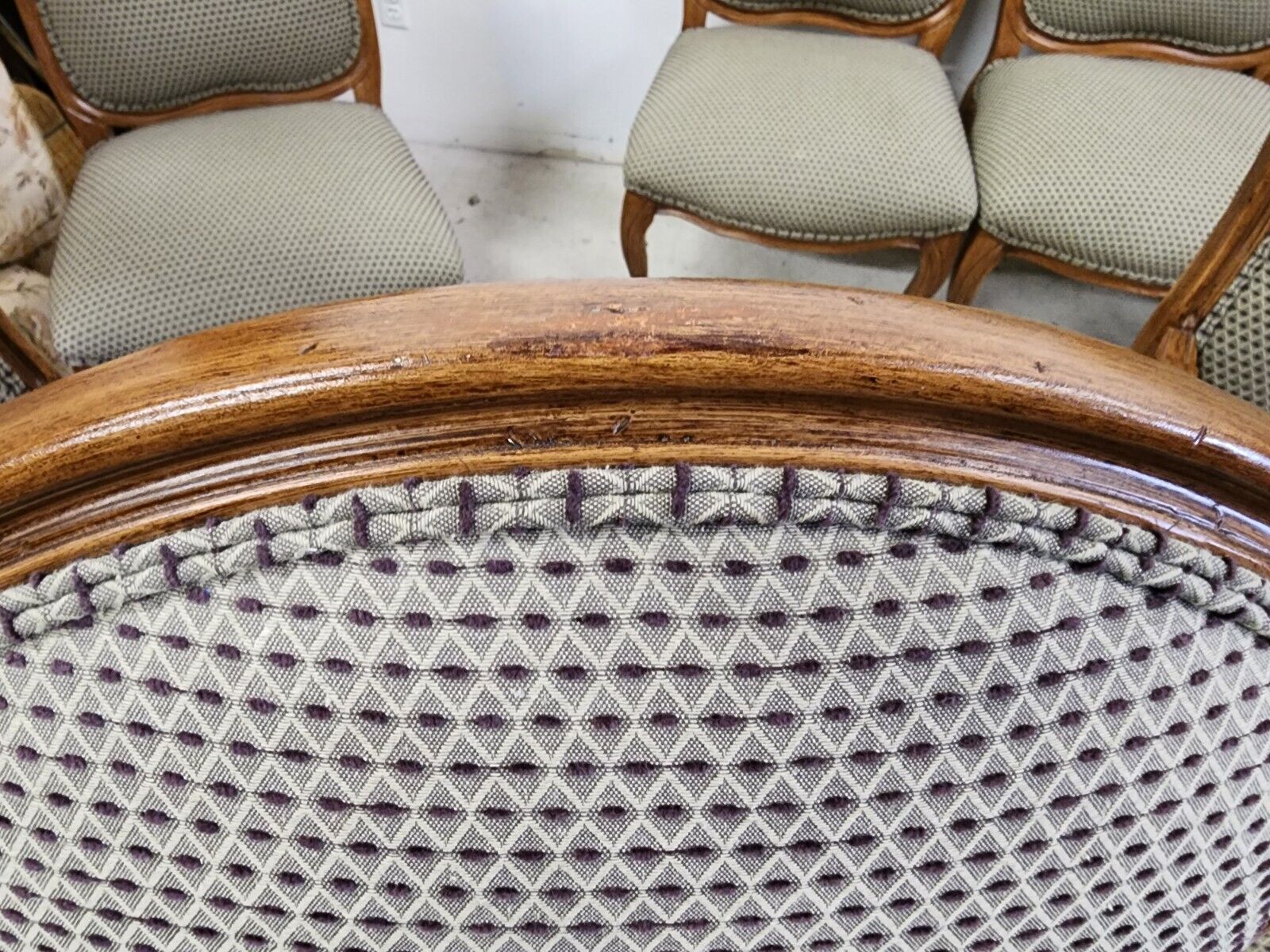 All are in structurally sound and sturdy condition. The armchairs shown in the 2nd photo look off colored but they are not-it was just a photo lighting issue. The fabric on all chairs is clean with no smells except 1 side chair has some faint stains as shown in pic 11. A few chairs have some light wear on their tops as shown in pics 8-10. The photos are an important part of the item description and condition so please use the zoom feature to view them closely.