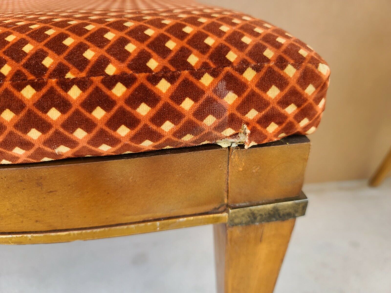 The MCM velvet fabric has some imperfections as shown. There is some wear to finish on the tops of the arms as shown.