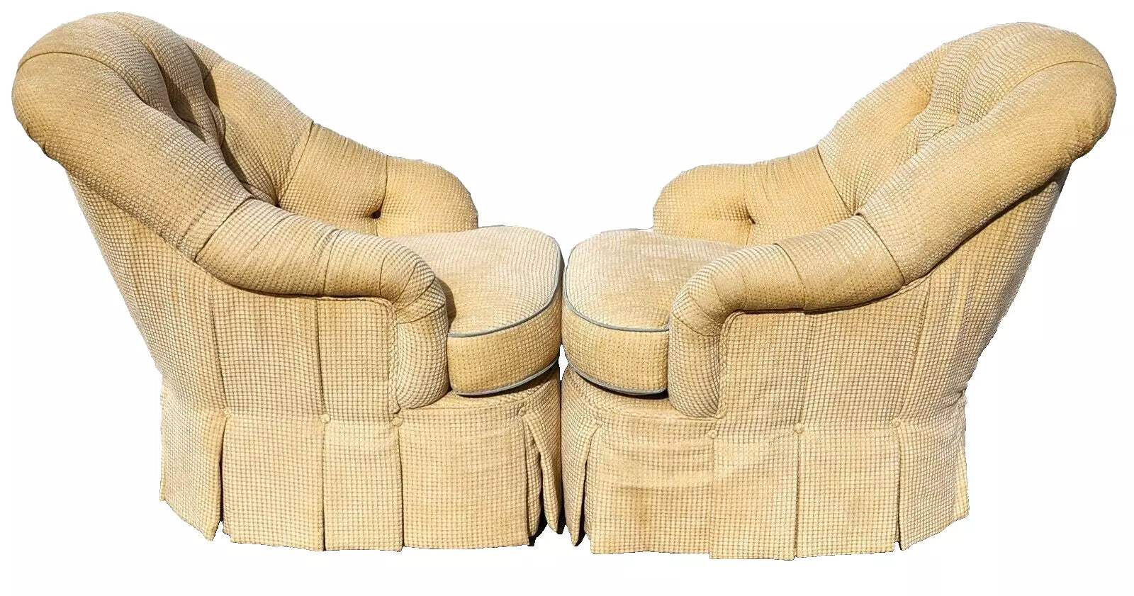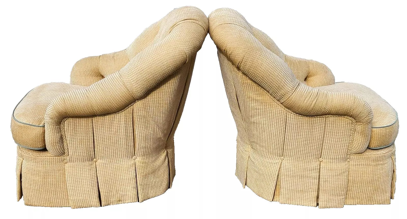 All the chairs are in the same, good, structurally sound, and sturdy condition. Very clean with no stains, soiling, smells or other notable damage EXCEPT there may be some faint soiling at the very bottom edge of the skirting near the floor which is visible upon close inspection. The photos and video are an important part of the item description and condition so please use the zoom feature to view them closely.