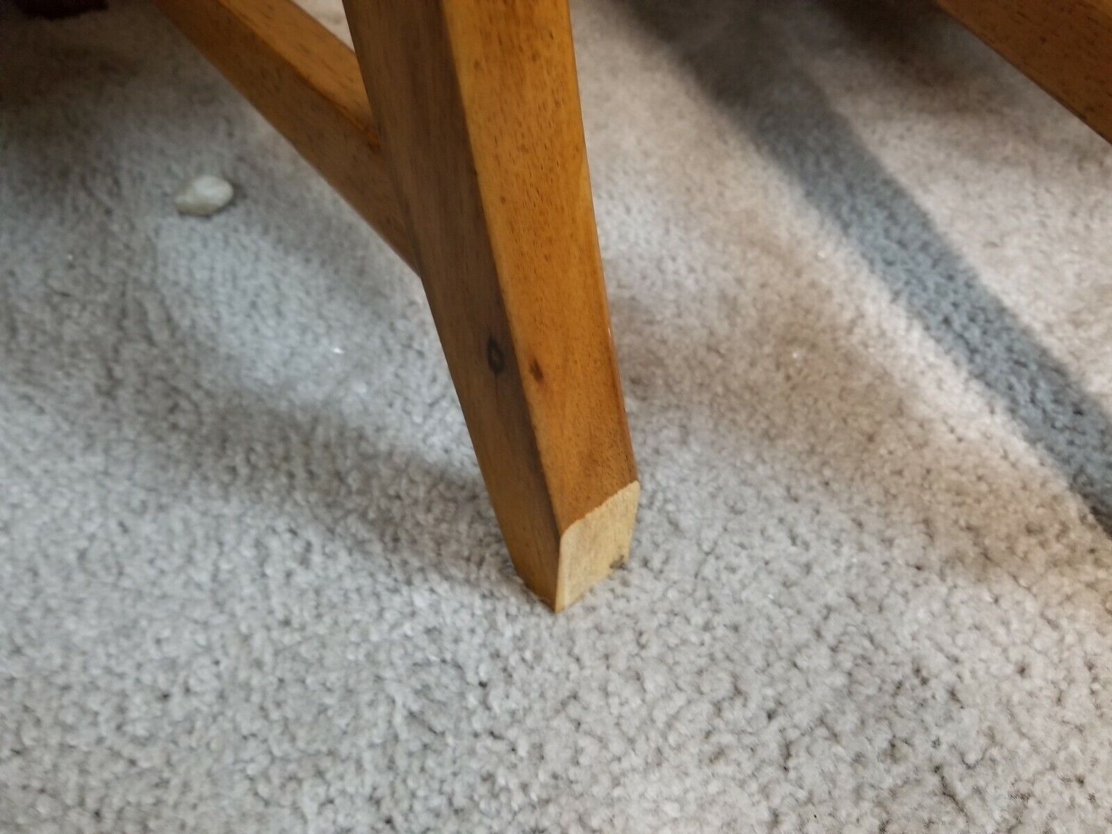One chair has a chip on back leg bottom as shown (but this does not affect the stability of it).