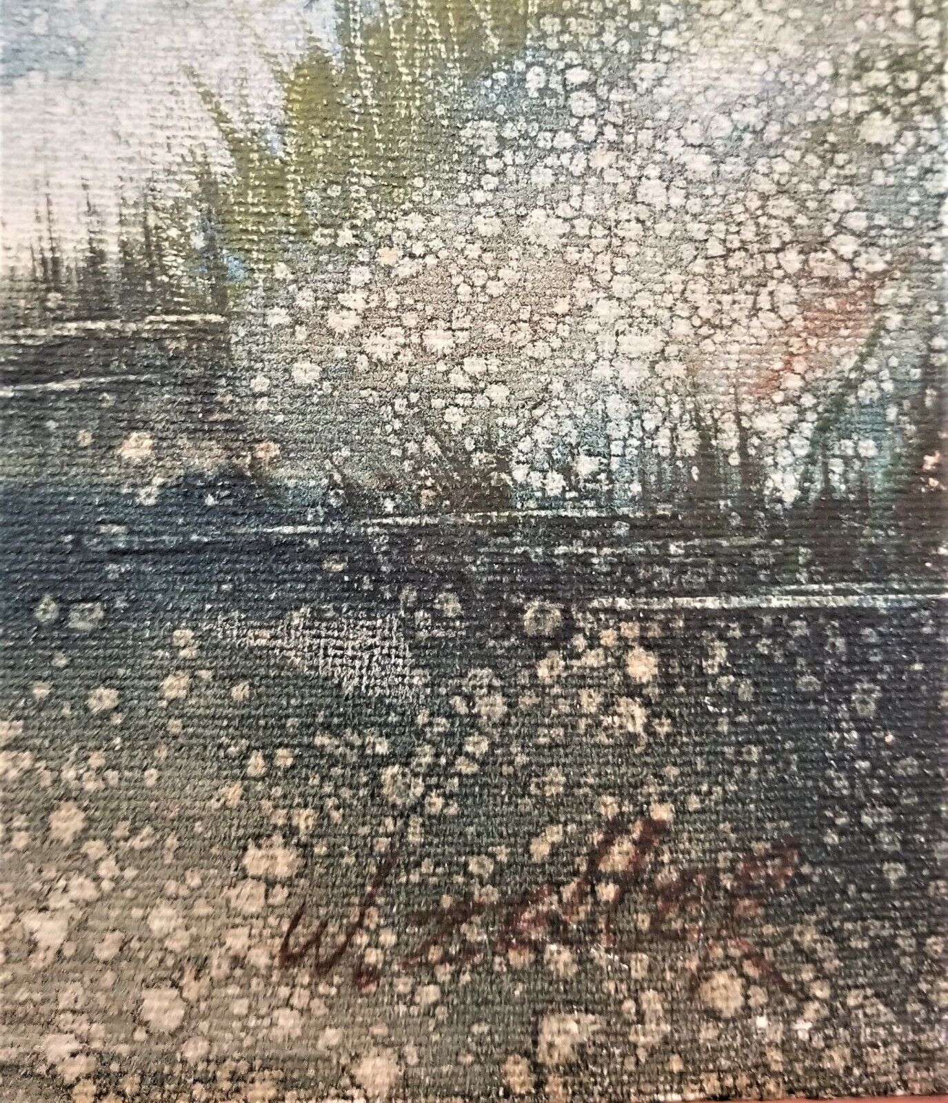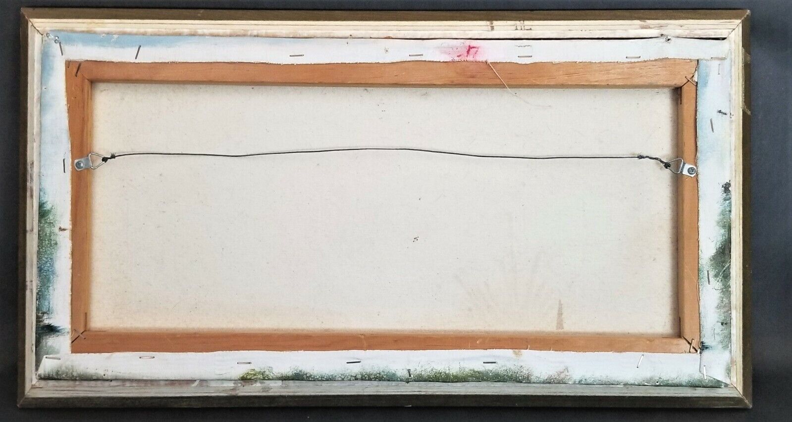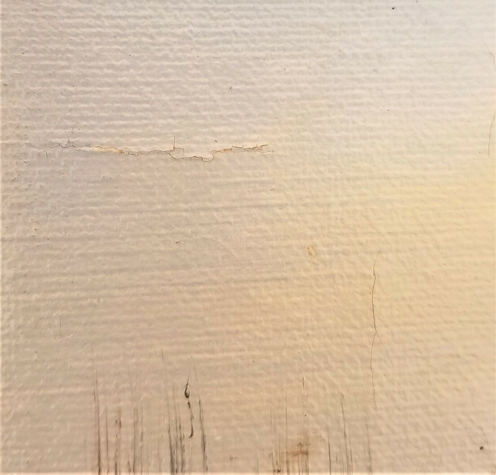 Painting has some small foxing spots. Wood frame is in good condition with small spots of wear as shown.