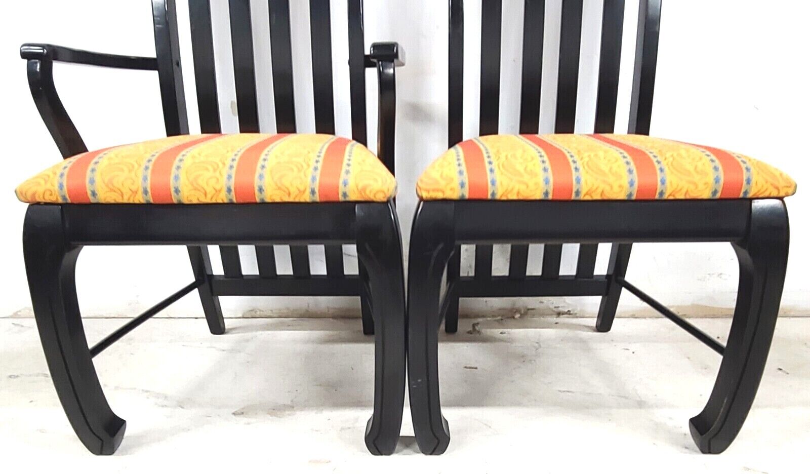 The upholstery has no stains or other notable damage but one of the armchairs is missing the uphosterey (as shown) so you could use a coordinated solid color on it to match the other chairs or reupholster both the armchairs in the same fabric. There is some wear to the finish mostly on the sides of the arms and on the top backs on some of the chairs. The photos are an important part of the item description and condition so please use the zoom feature to view them closely.