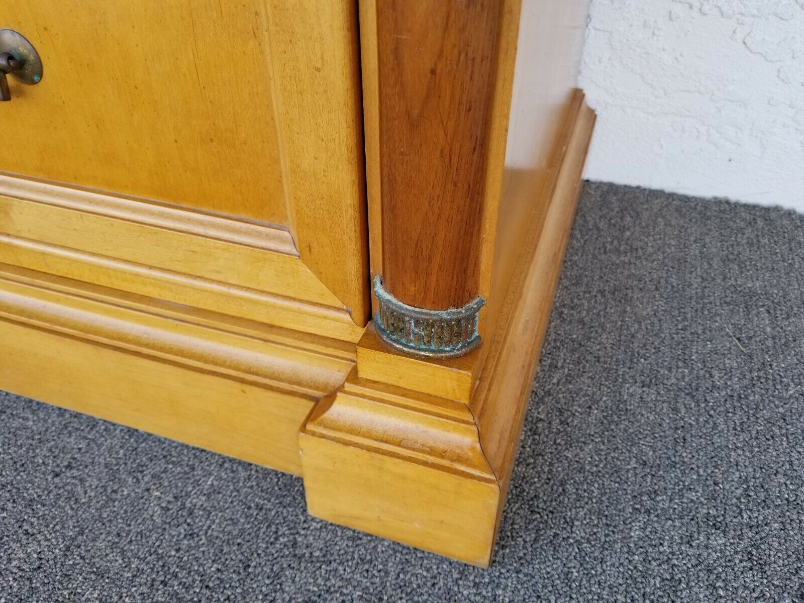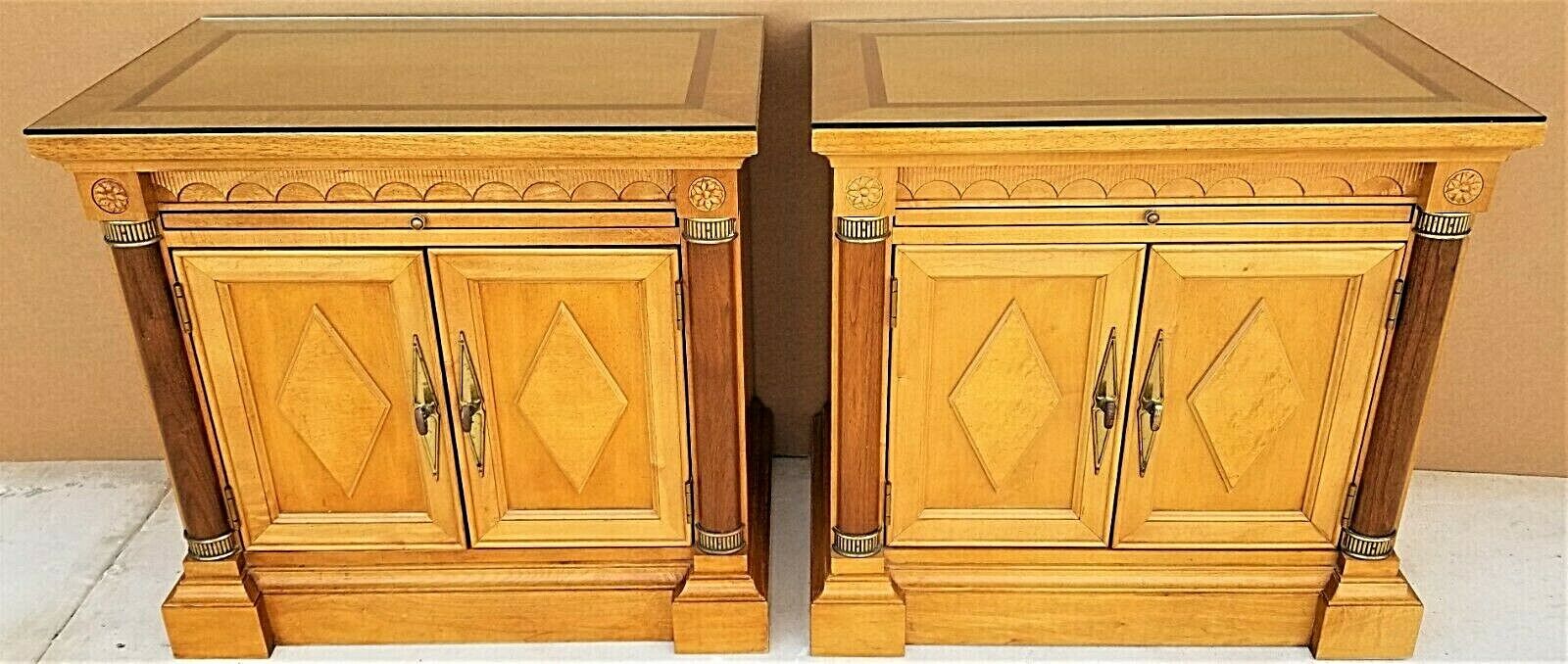 Pair of Vintage STANLEY Neoclassical Nightstands with Burl Wood Accents, Pullout Trays & Custom Glass Tops
