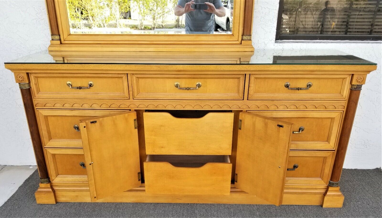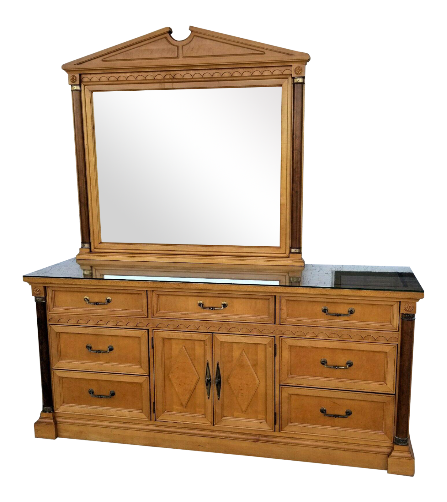 STANLEY FURNITURE Art Deco Dresser with Matching Mirror and Custom Glass Top