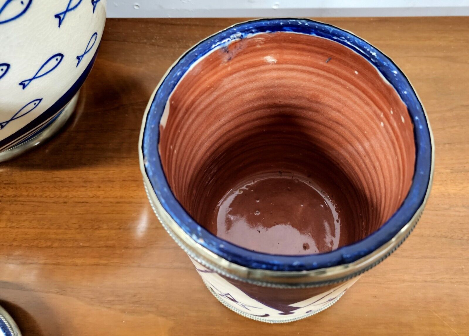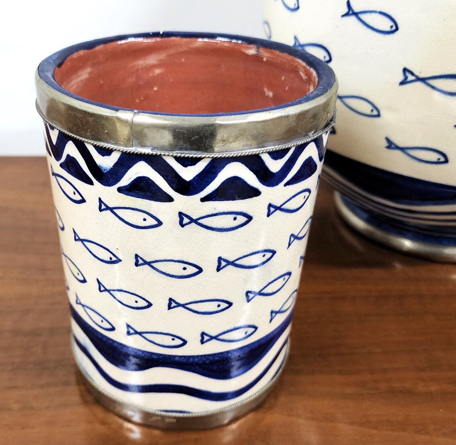 All pieces are trimmed in decorative metal (which also protects the edges) and also glazed on the inside for easy cleaning.