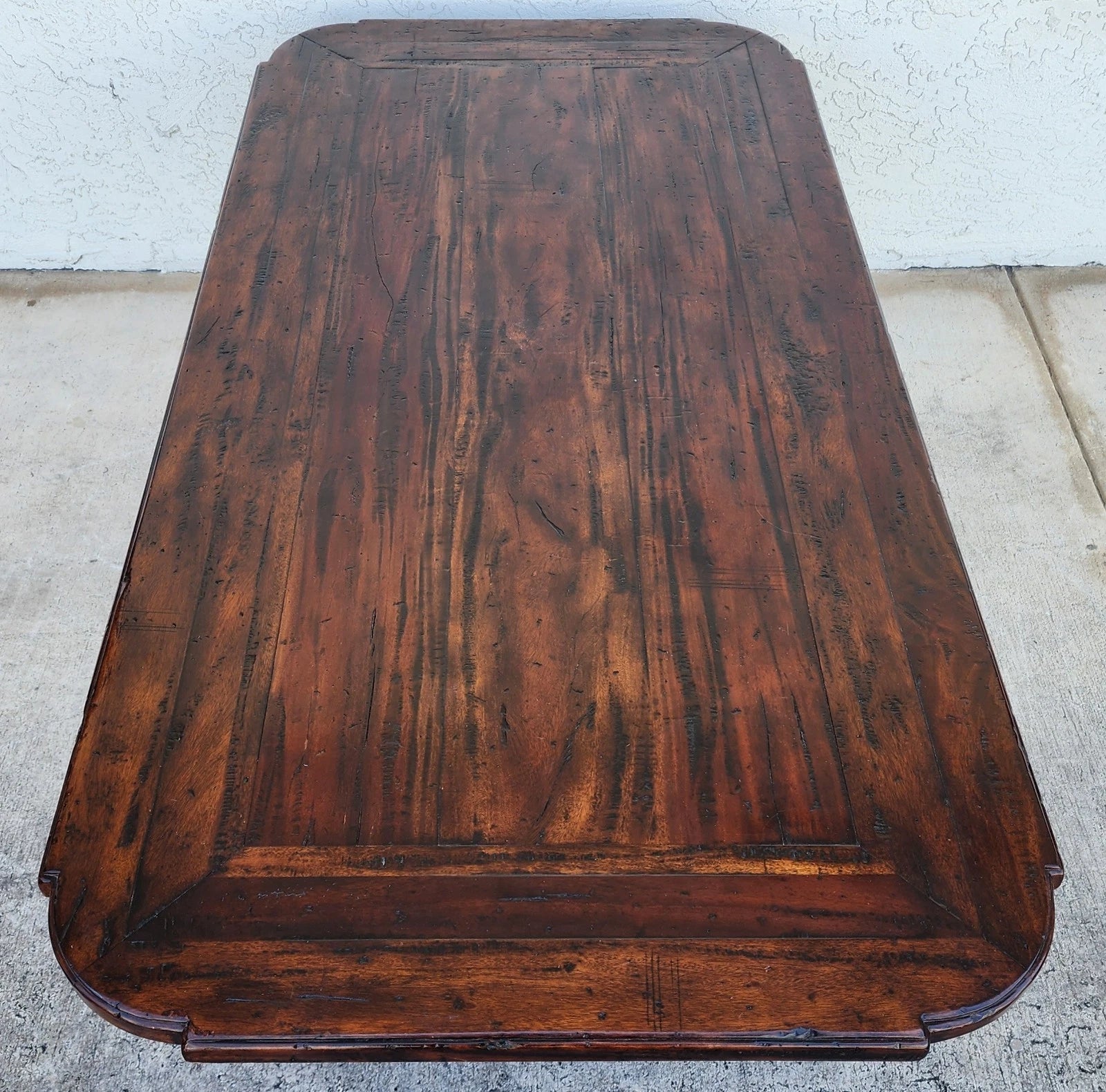 Exceptional traditional design of the antiqued wood cocktail table with rounded rectangular top with re-entrant corners and resting above double turned end balusters joined by a pegged stretcher.