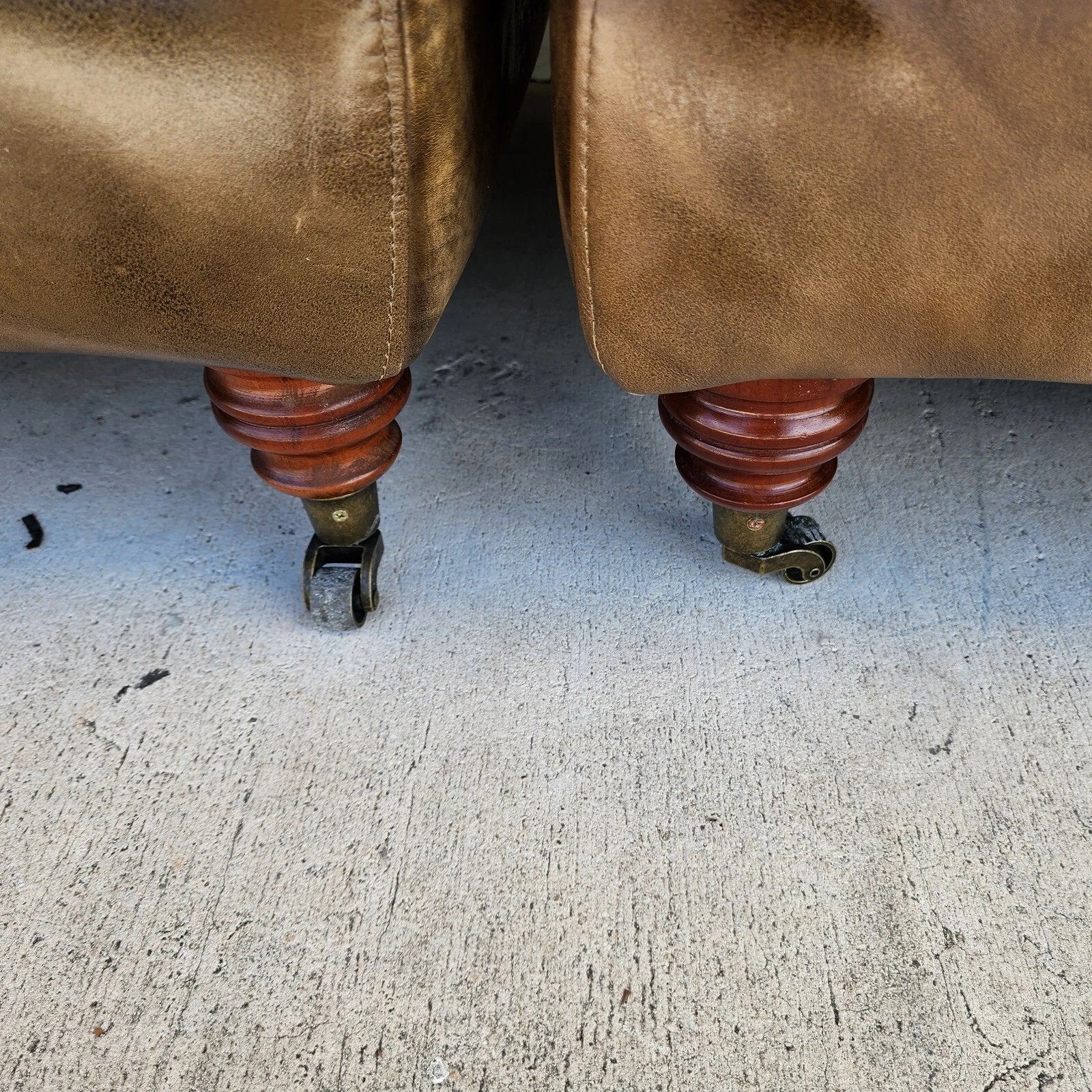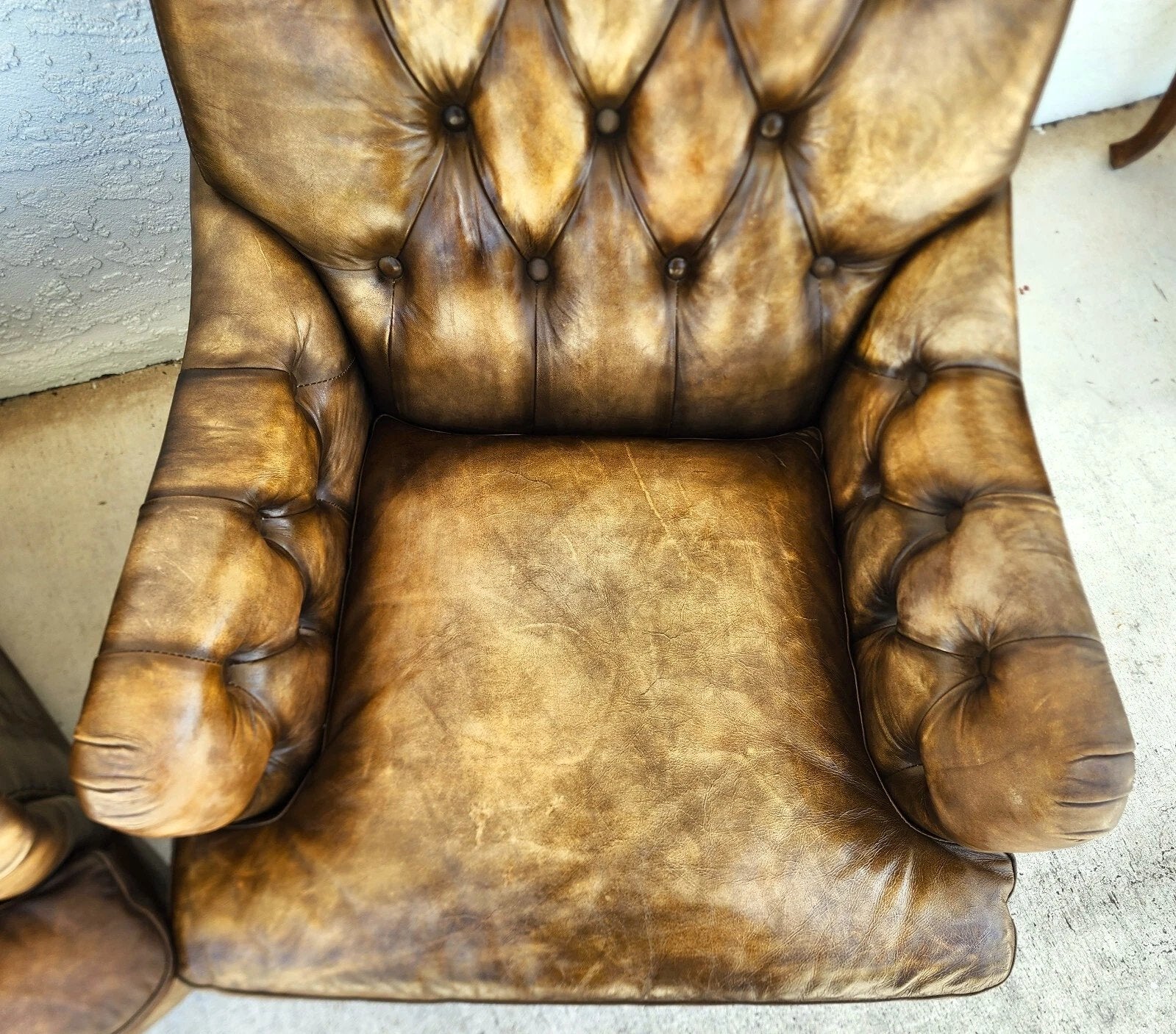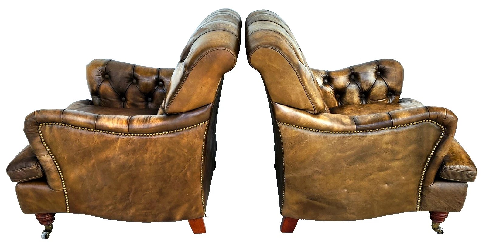 Pair of Top Grain Distressed Leather English Chesterfield Style Low Profile Club Chairs