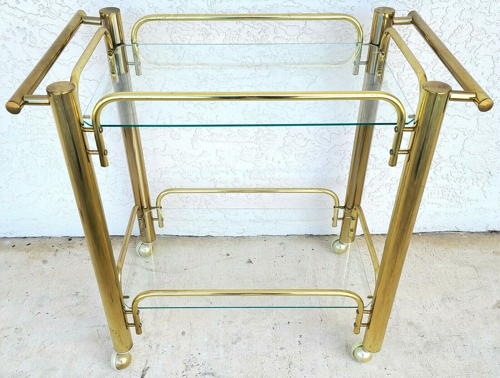 Vintage Folding Brass & Glass Rolling 3 Tier Bar Tea Serving Cart