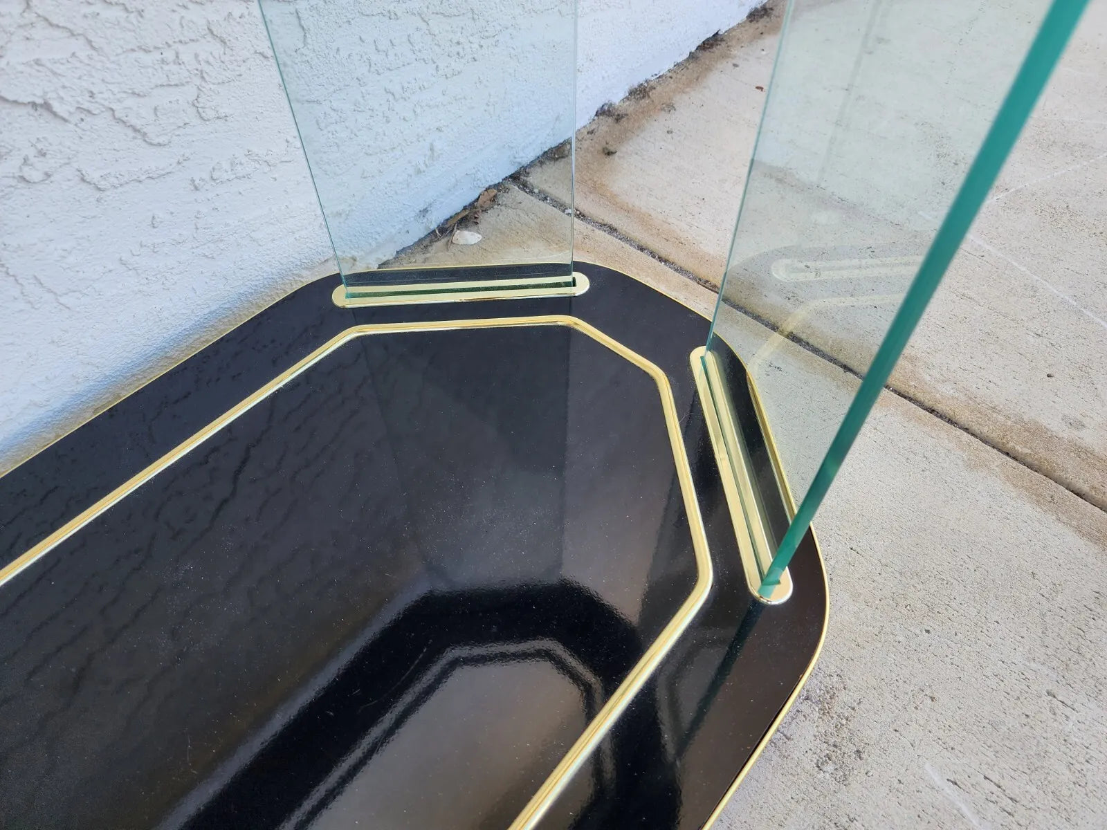 Top is glass with mirrored trim around edges. Bottom is a water and stain resistant glossy black material.