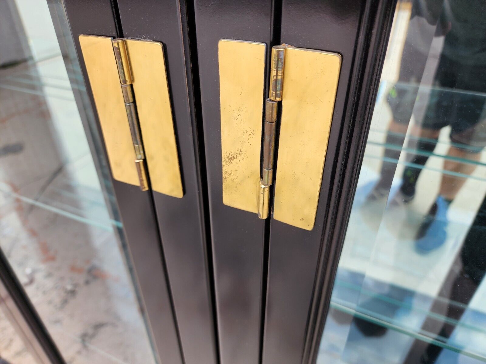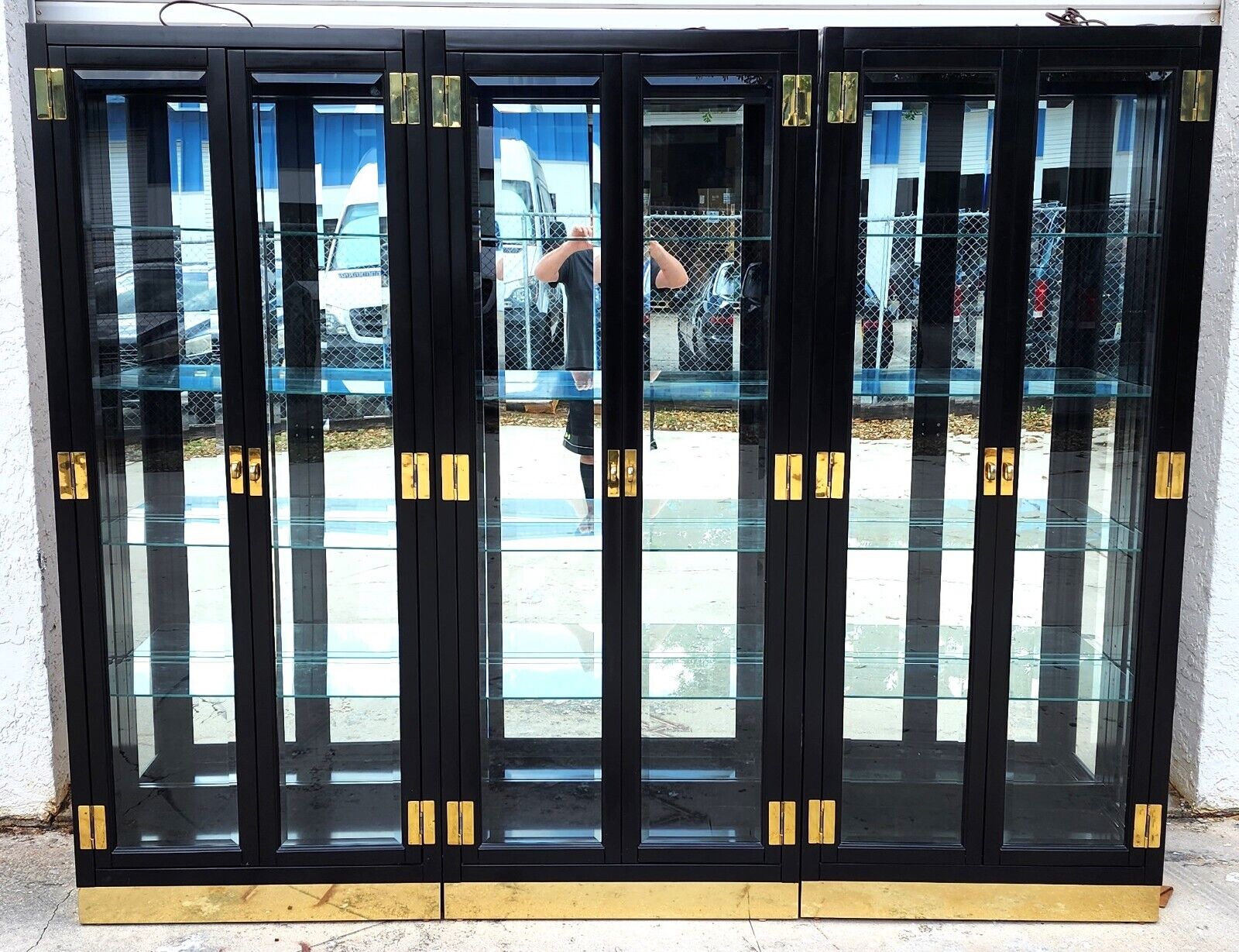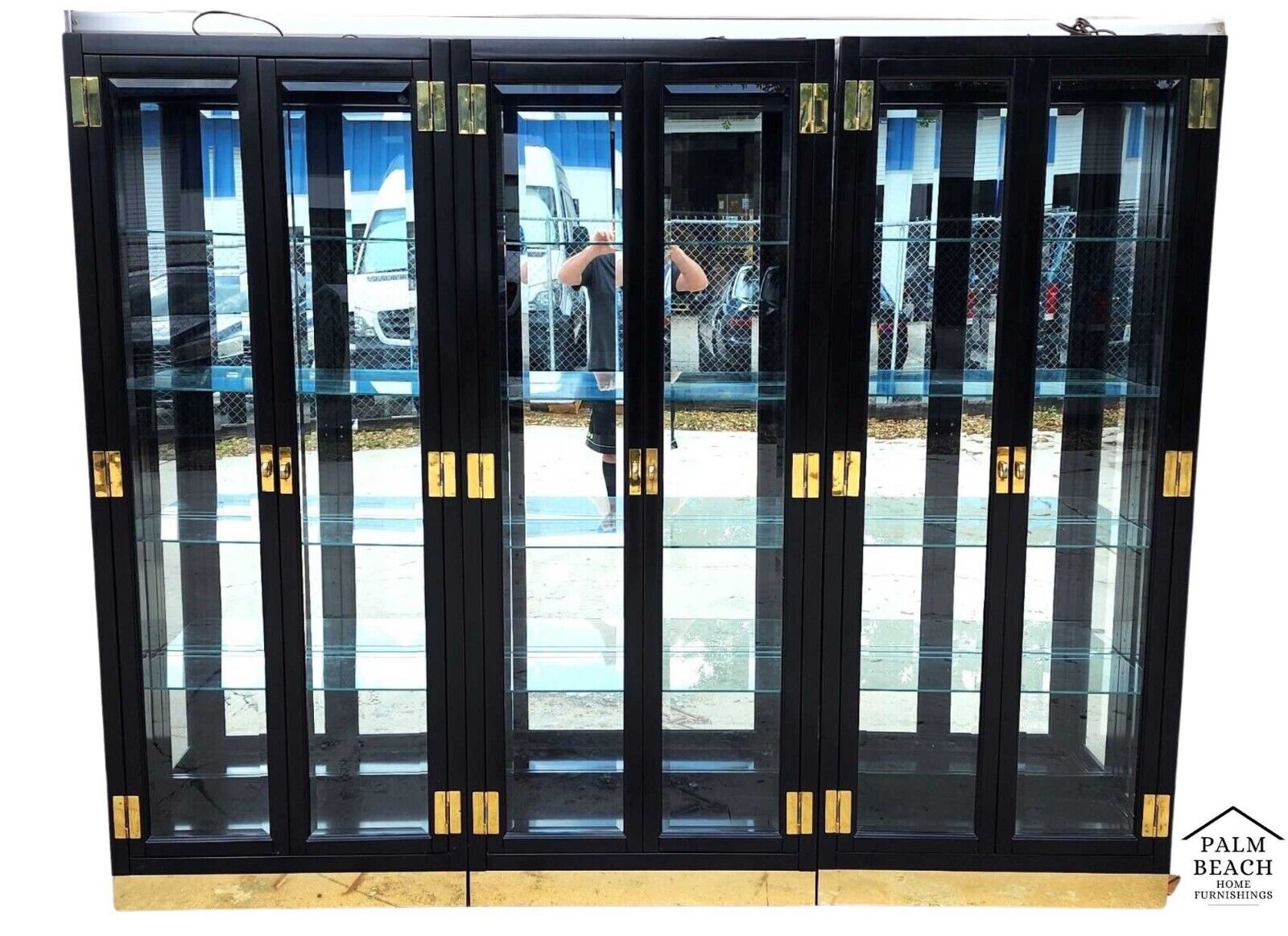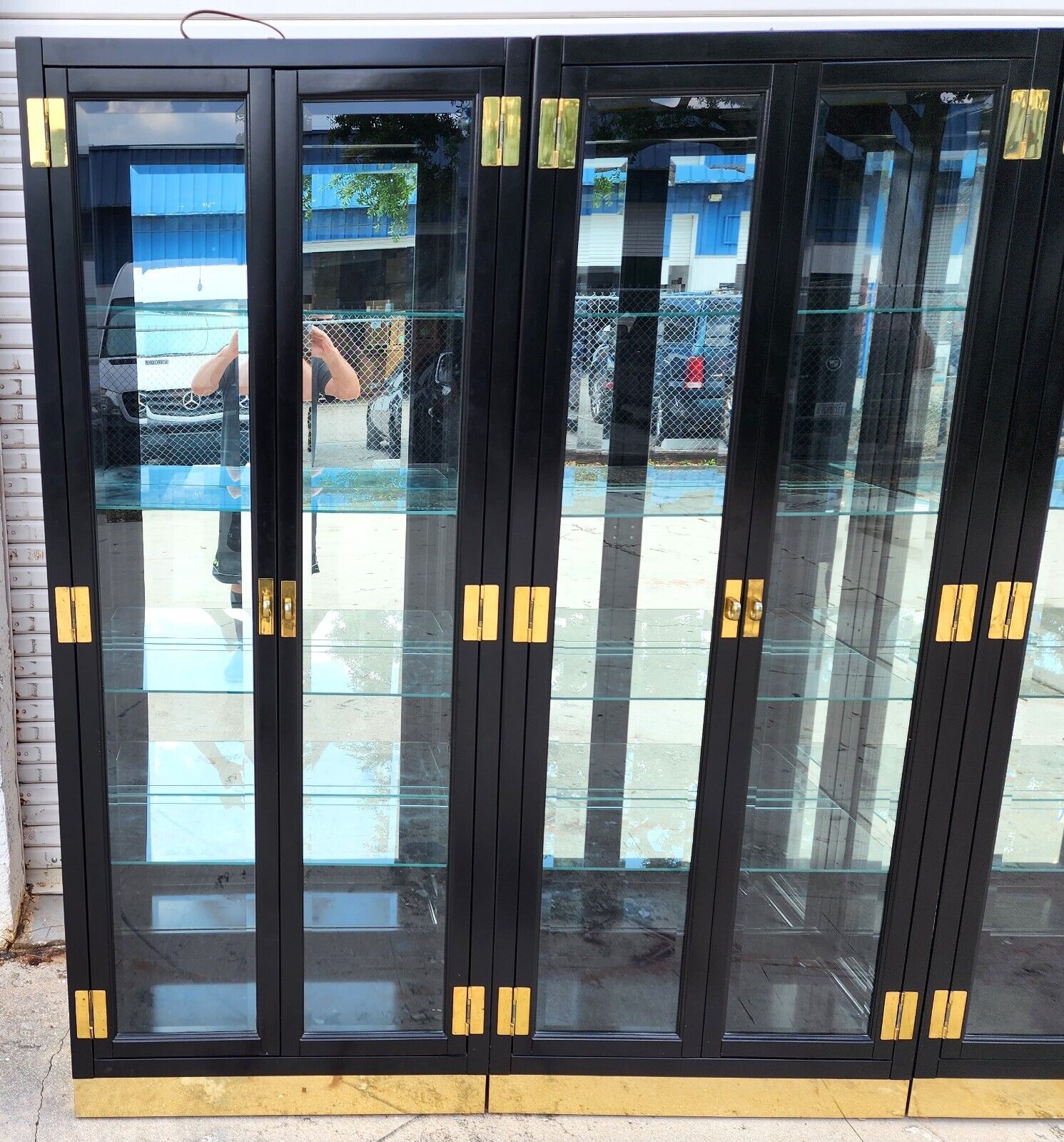 Black lacquer frame trimmed in brass with 4 adjustable glass shelves each and lit by 1 light from above.