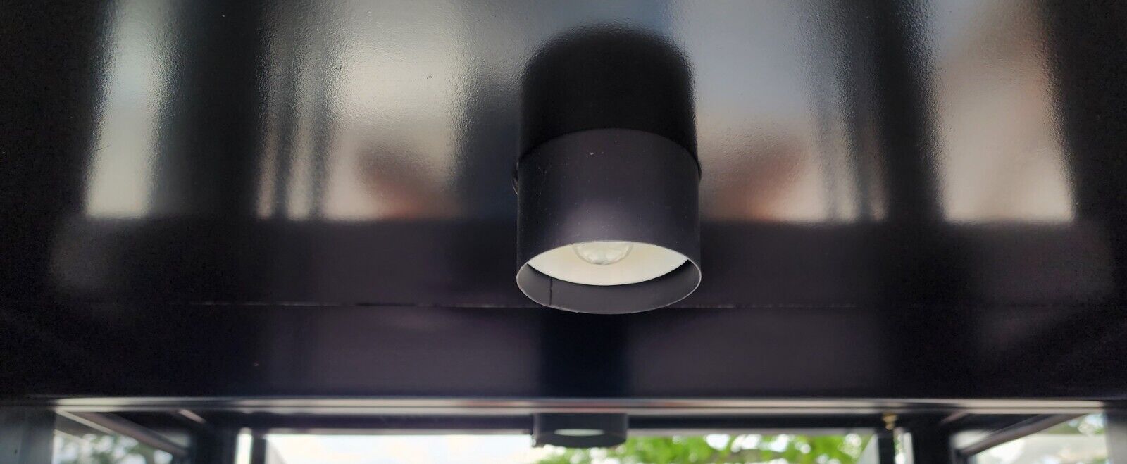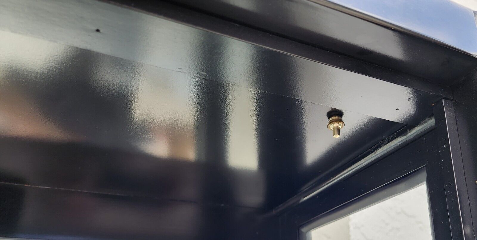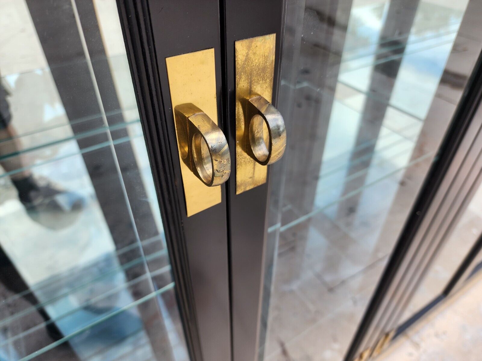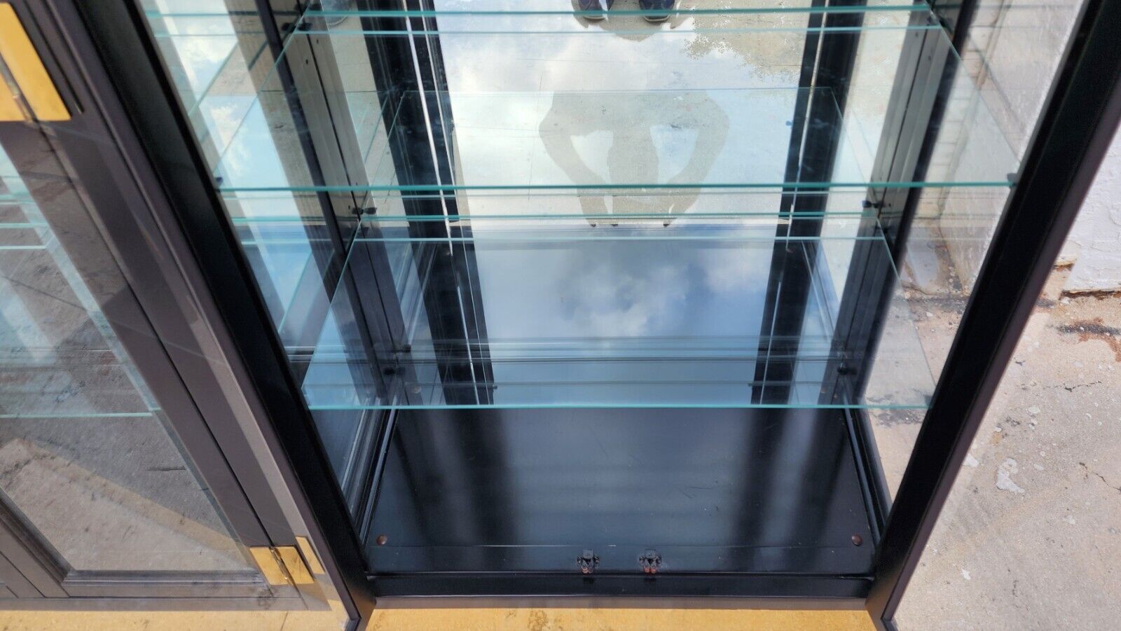 Black lacquer frame trimmed in brass with 4 adjustable glass shelves each and lit by 1 light from above.