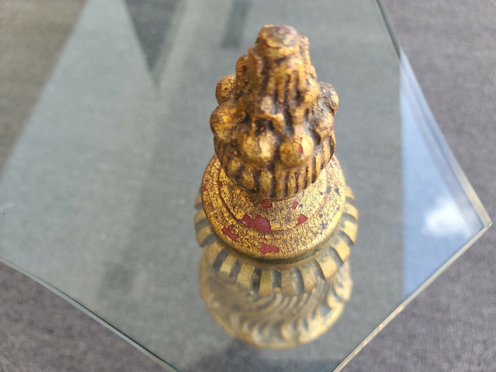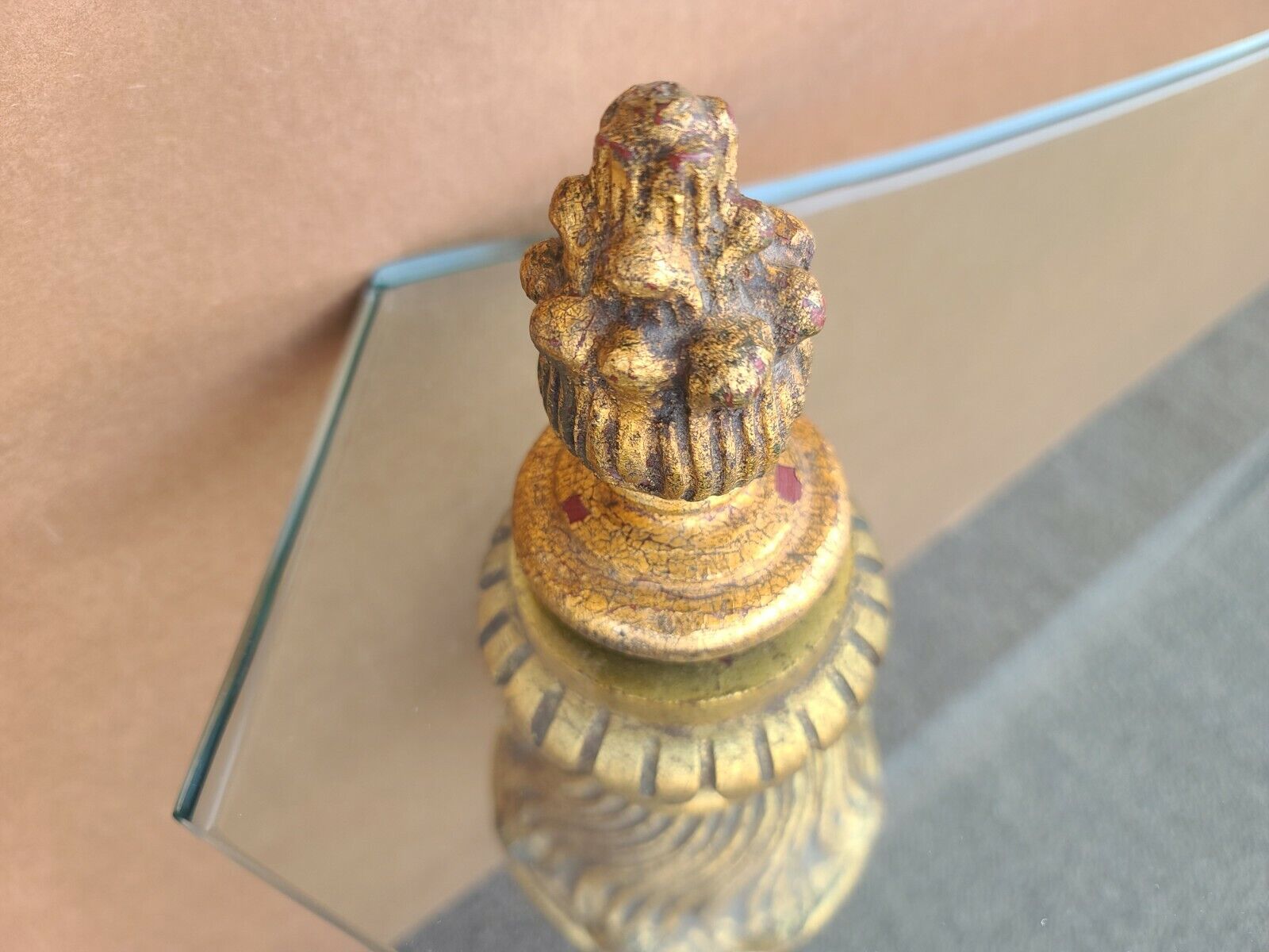 Structurally sound and sturdy with no notable damage to the glass. Carved solid wood supports have some