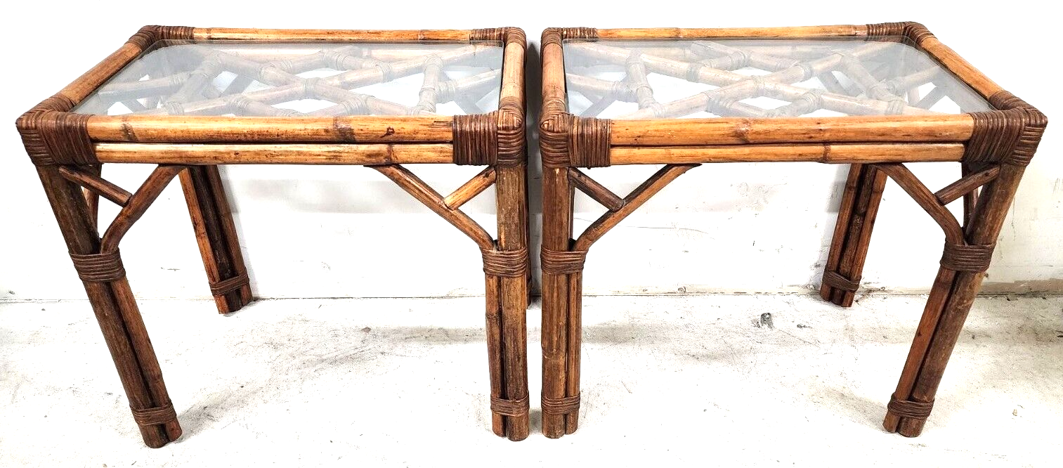 Pair of Vintage 1960s French Bamboo Rattan Glass Side Tables