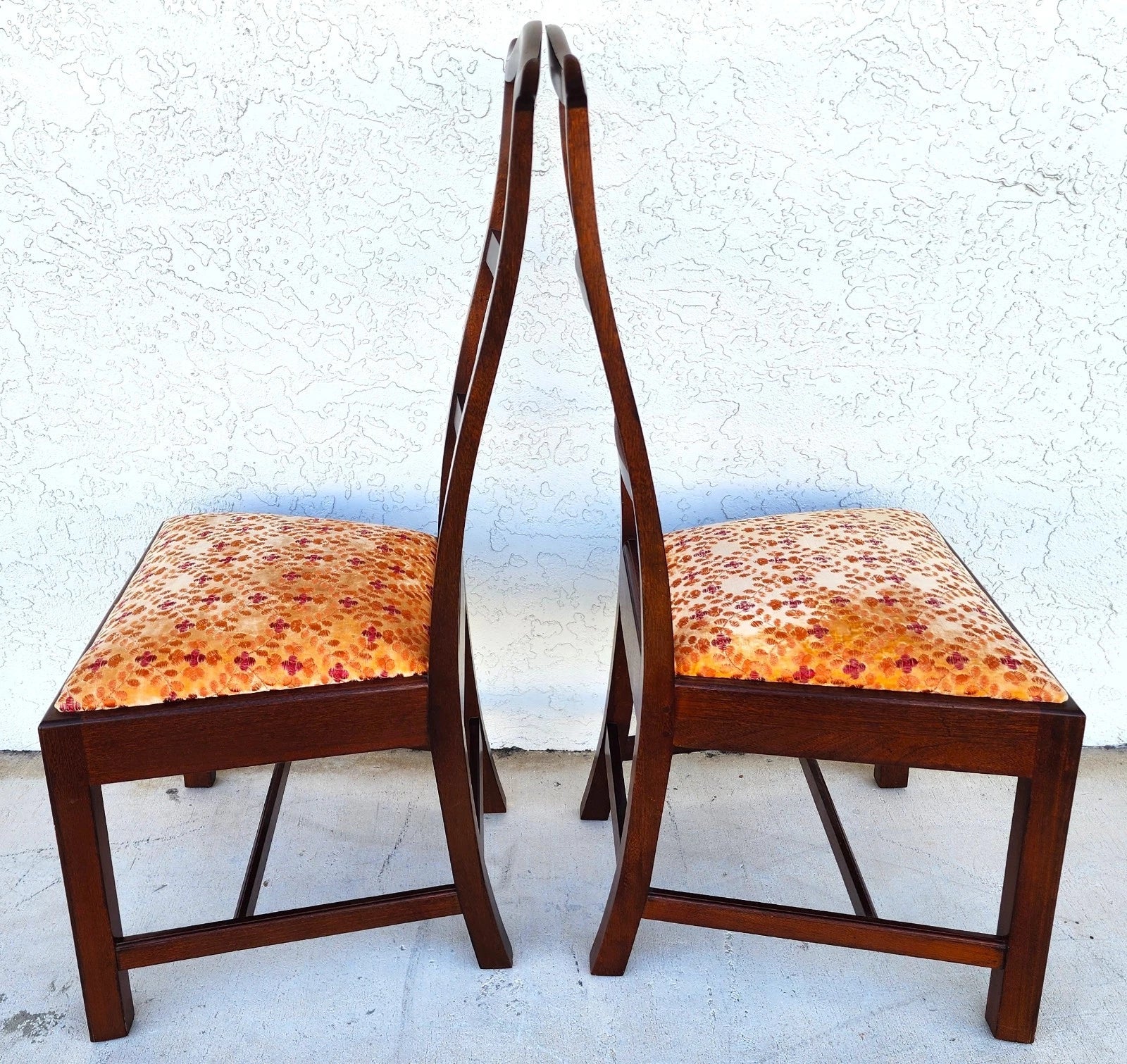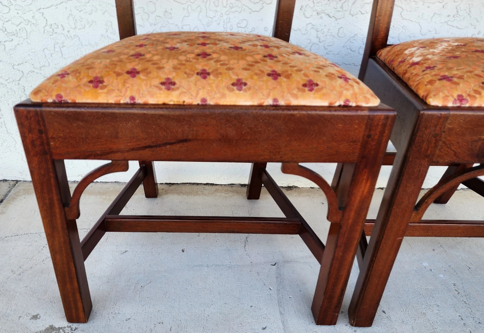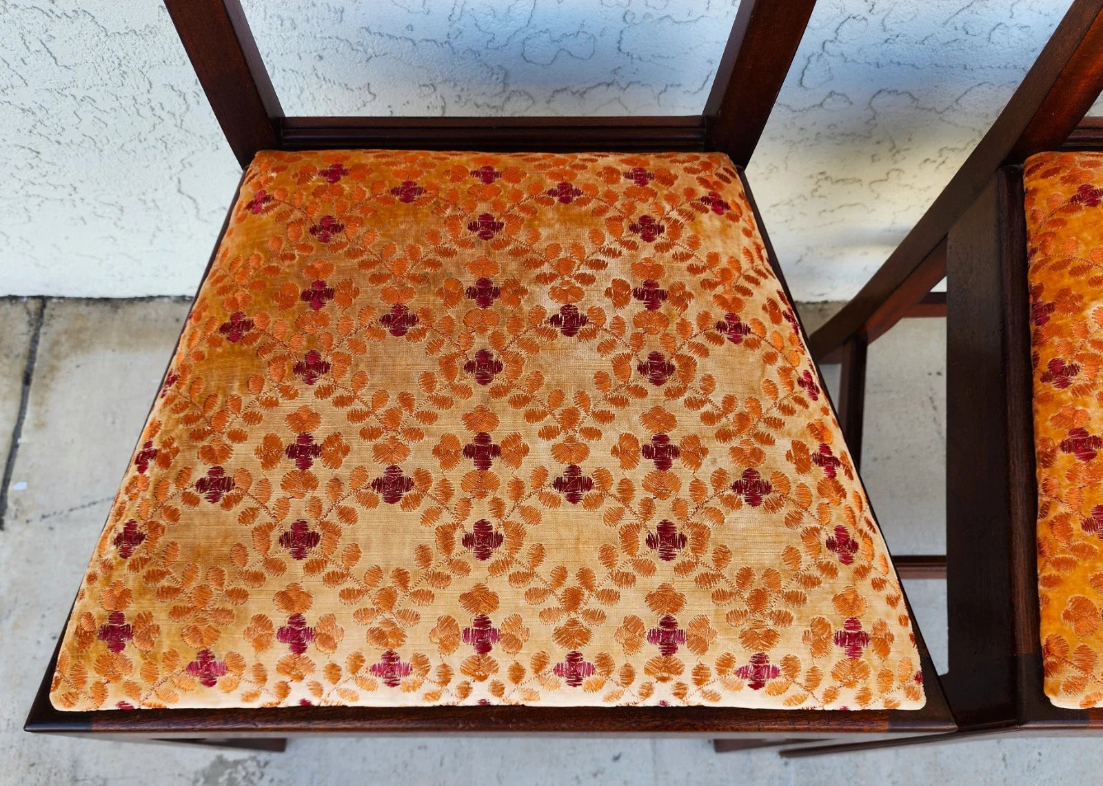 In good, structurally sound, and sturdy condition with no notable damage to frames. No stains on fabric but there are coloration variations because of the nature of the velvet fabric. The photos and video are an important part of the item description and condition so please use the zoom feature to view them closely.