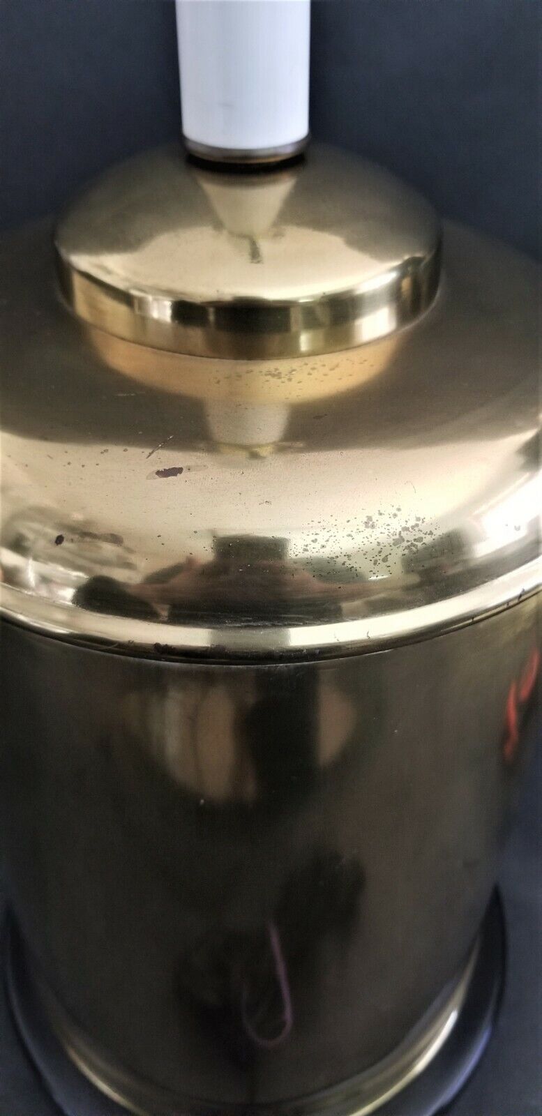 Good working condition with 3 Way Switch. Extra Long Cord. There is a slight indentation in two place on the body. Has some age-related patina on brass base and stem.