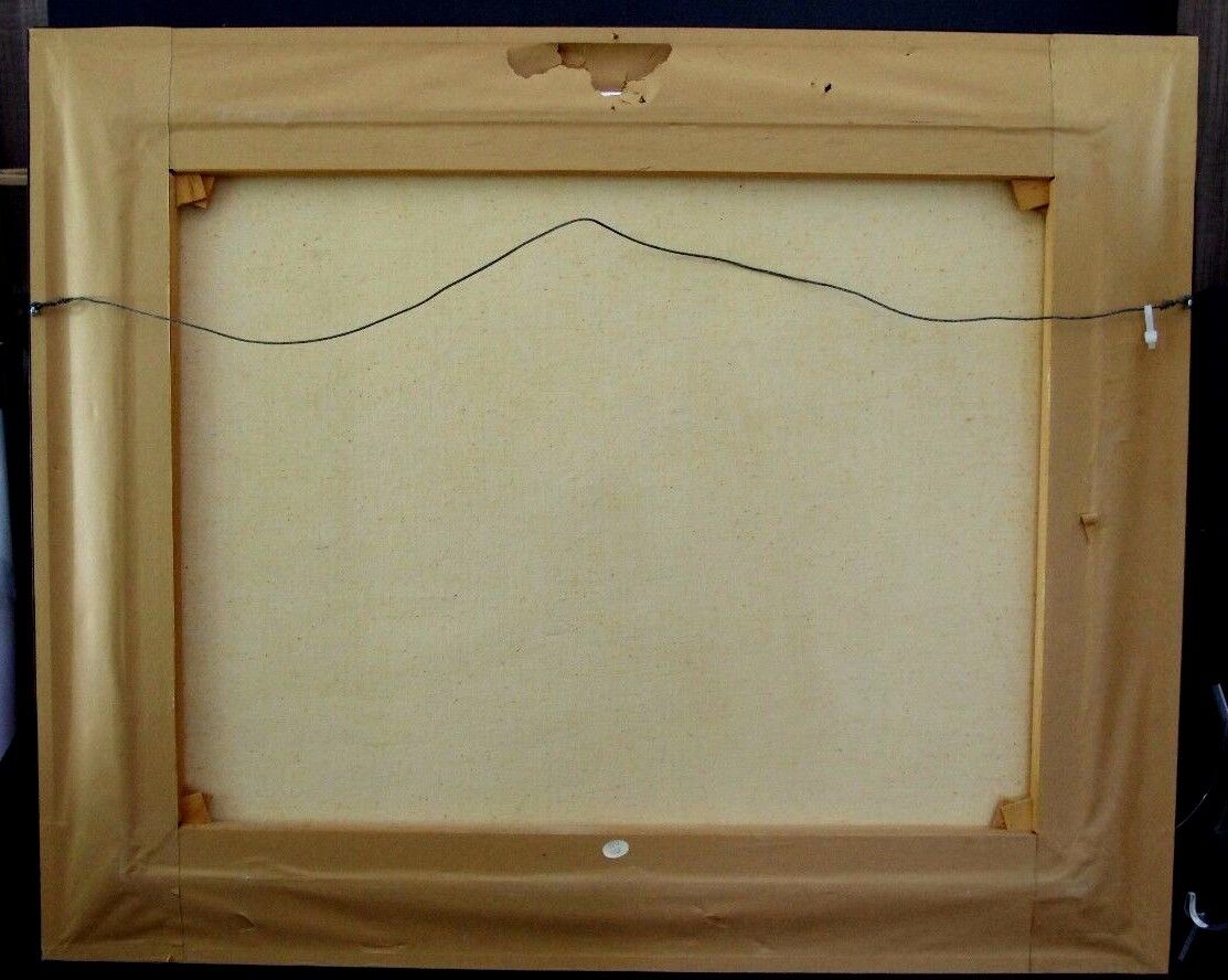 Painting has a touched up spot in upper right hand quadrant as shown in 3rd photo. Frame has a few dings/scratches.