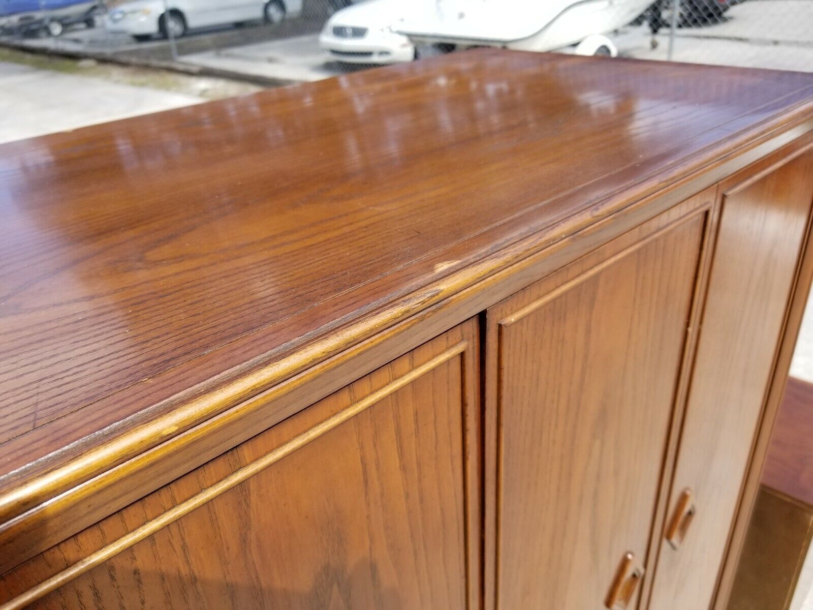 Structurally sound and sturdy. There is some age-related wear to finish mostly on the top front edge as shown.