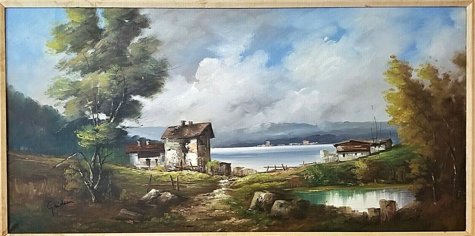 Wonderful Mid Century Artist Signed Italian Lakeside Landscape Oil Painting