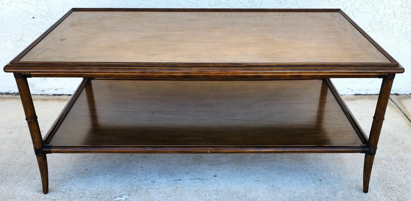 Featuring a molded rectangular top and lower shelf resting on four turned faux bamboo legs with both bound to the legs with leather rattan straps.